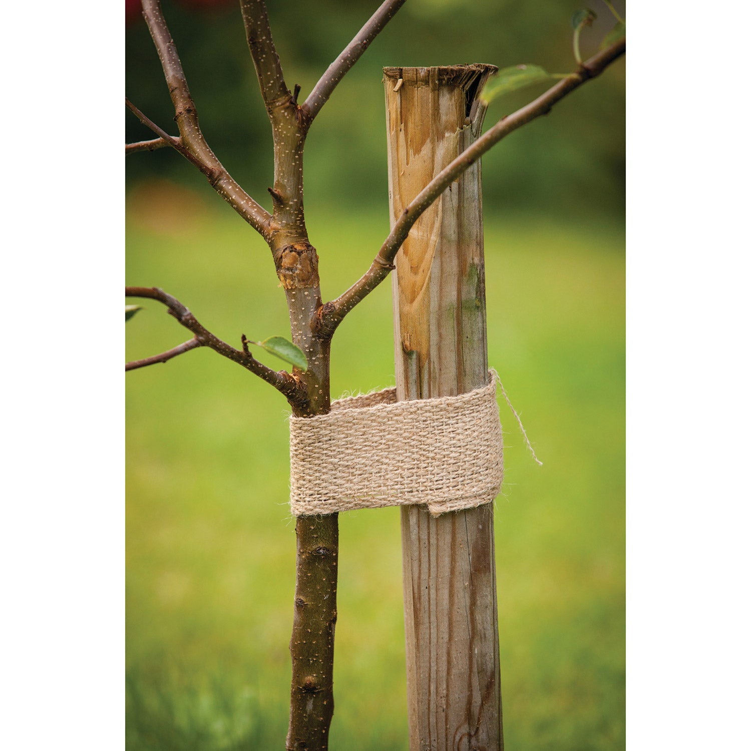 Du klipper et stykke af i den ønskede længde, vikler det forsigtigt om stænglen eller grenen samt en støtte som en pind eller et stativ og binder eller folder det fast, så det sidder solidt uden at skære ind. Båndet er smidigt nok til at kunne bøjes omkring kurver og bredt nok til ikke at skære ind. Jutebåndet giver et sikkert greb uden at beskadige planten.