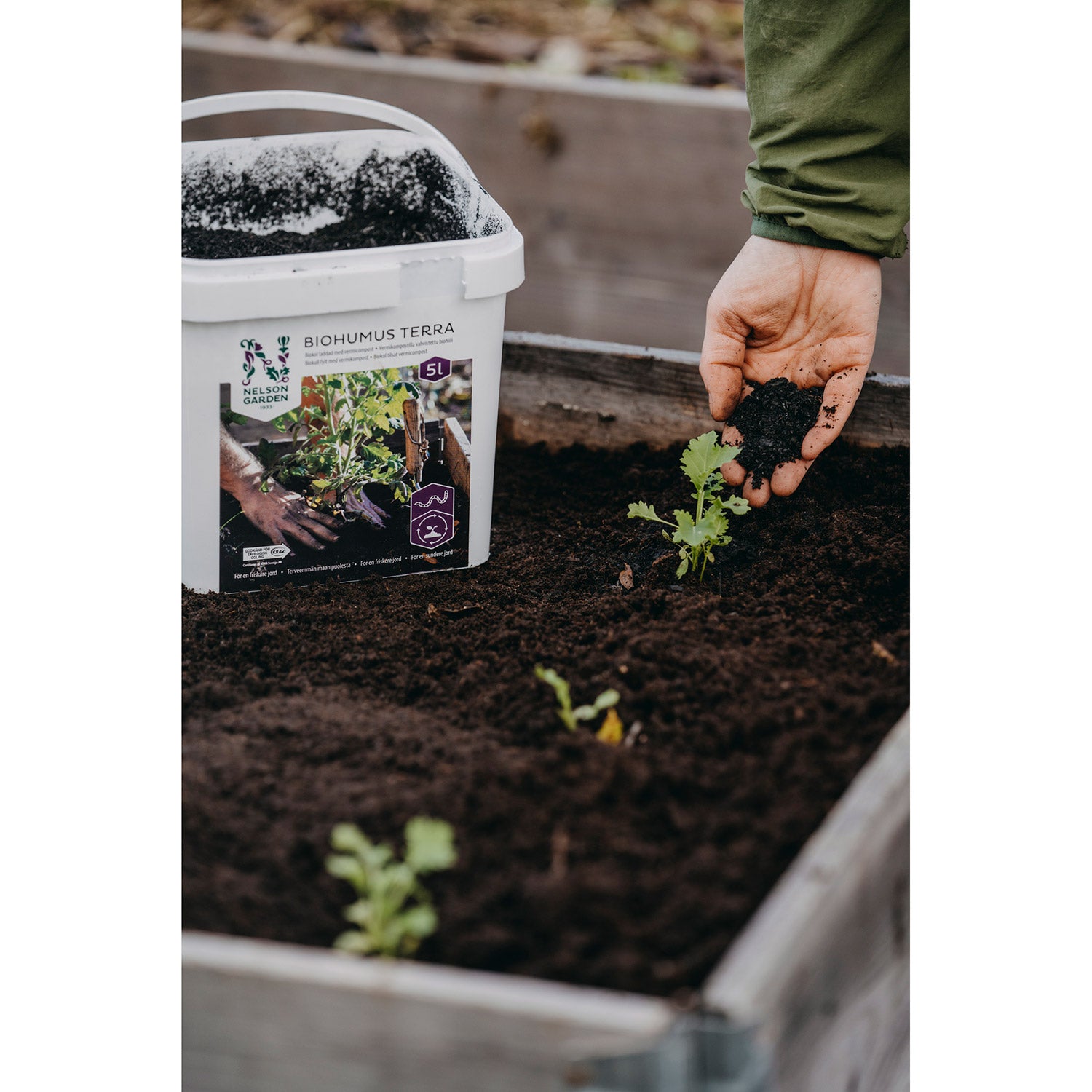 Biohumus Terra er en wormekompost af høj kvalitet, også kaldet vermikompost, fra Nelson Garden. Det er et naturligt jordforbedringsmiddel, der består af vermikompost (organisk materiale omdannet af orme) samt Biochar. Komposten er fyldt med nyttige jordmikrober, svampe, humus og fulvosyrer, som tilsammen sikrer en sund og frugtbar jord. I denne variant, Biohumus Terra, er der tilsat Biochar: dette kulstof hjælper med at holde på jordens fugt og øger jordens frugtbarhed. Biohumus er lugtfri og egnet til alle plantens vækststadier, indendørs eller udendørs.