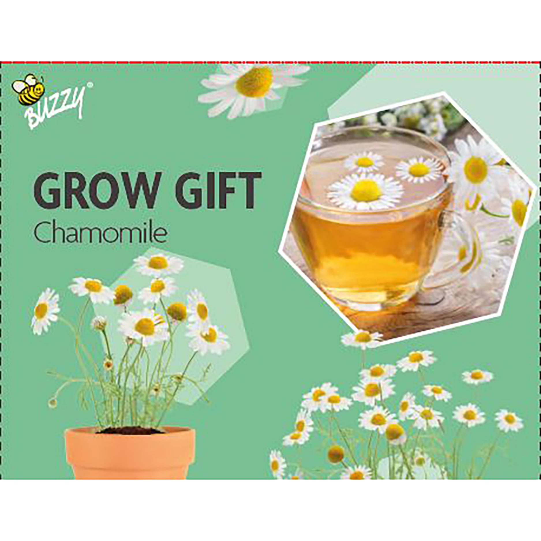 Buzzy Grow Gifts Kamille er et komplet mini-dyrkningssæt, ideelt til alle, der på en enkel måde vil så kamille og nyde en lille urtehave derhjemme. Sættet består af en terracottakrukke, en tablet med pottemuld og kamillefrø, så De har alt, hvad De skal bruge for at komme i gang med det samme.