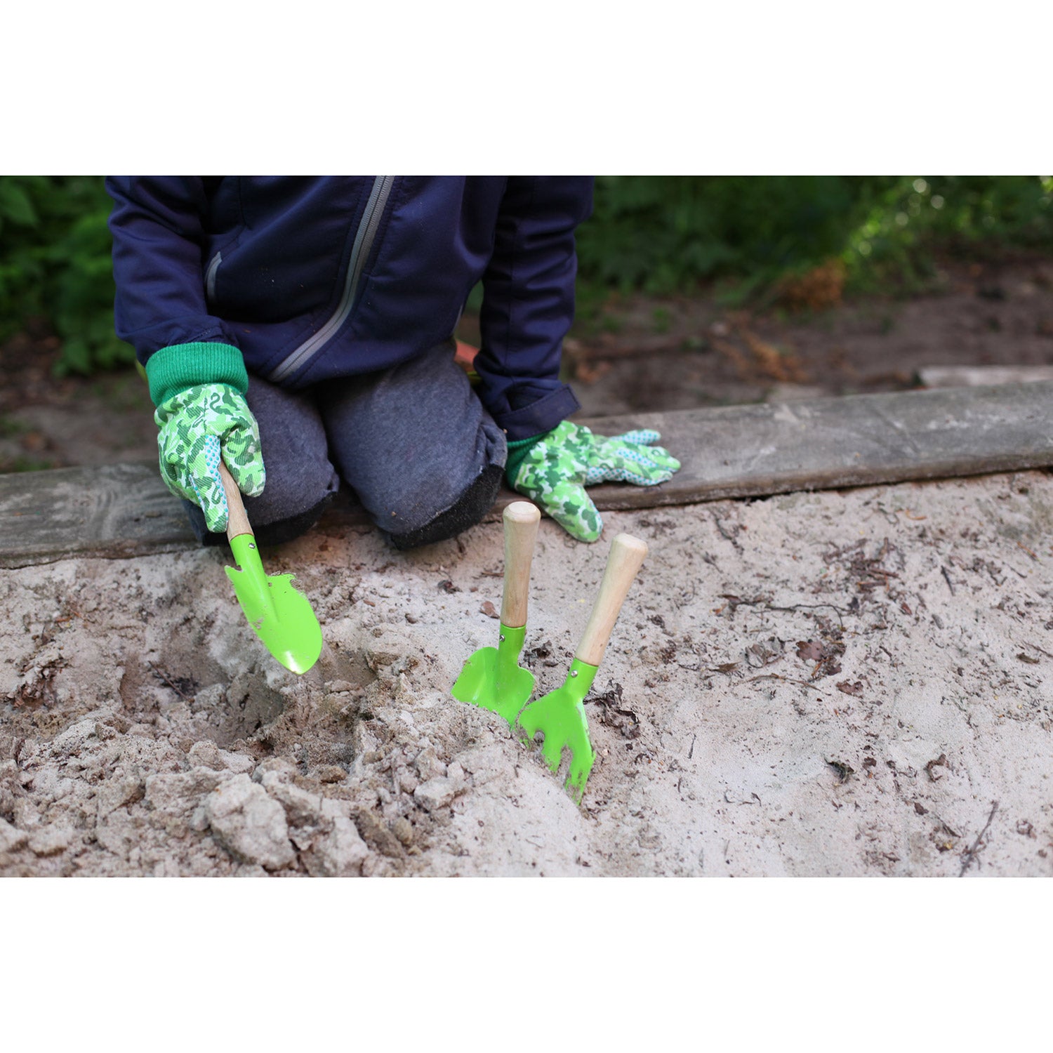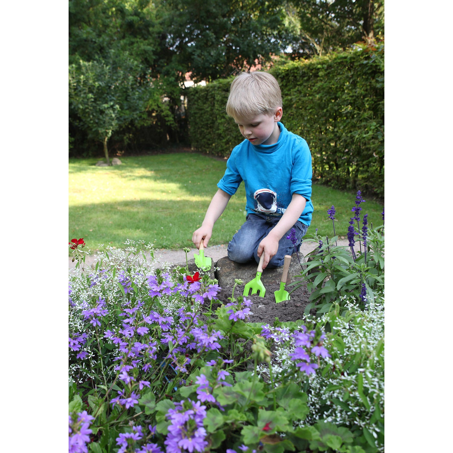 Dette søde 3-delte børnehaveredskabssæt er ideelt til de yngste havefolk, fra tumlinger til småbørn op til cirka 3 år. Sættet indeholder en håndskovl, en planteskovl og en håndrive, alle designet i de rette størrelser til små hænder. Redskaberne er lavet af blødt schimatræ og blødt stål, så de er sikre og nemme at bruge for de allermindste.