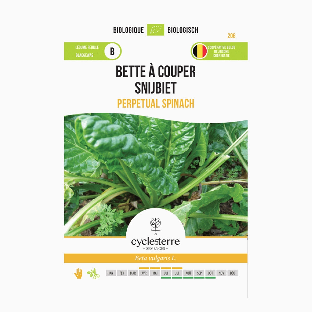 Evighedsspinat kan sås udendørs fra april til midt i juli i 2 cm dybde i rækker med 40 cm mellem rækkerne. Når spirerne er kommet op, kan planterne udtyndes til en indbyrdes afstand på 30 cm. Denne afgrøde er perfekt til dyrkning på friland, men kan også trives godt i et drivhus. Efter cirka 70 dage kan de første blade høstes, og ved at foretage en anden såning sidst på sæsonen kan du også høste i vintermånederne. Overvintring er mulig, hvis planterne ikke bliver for store.