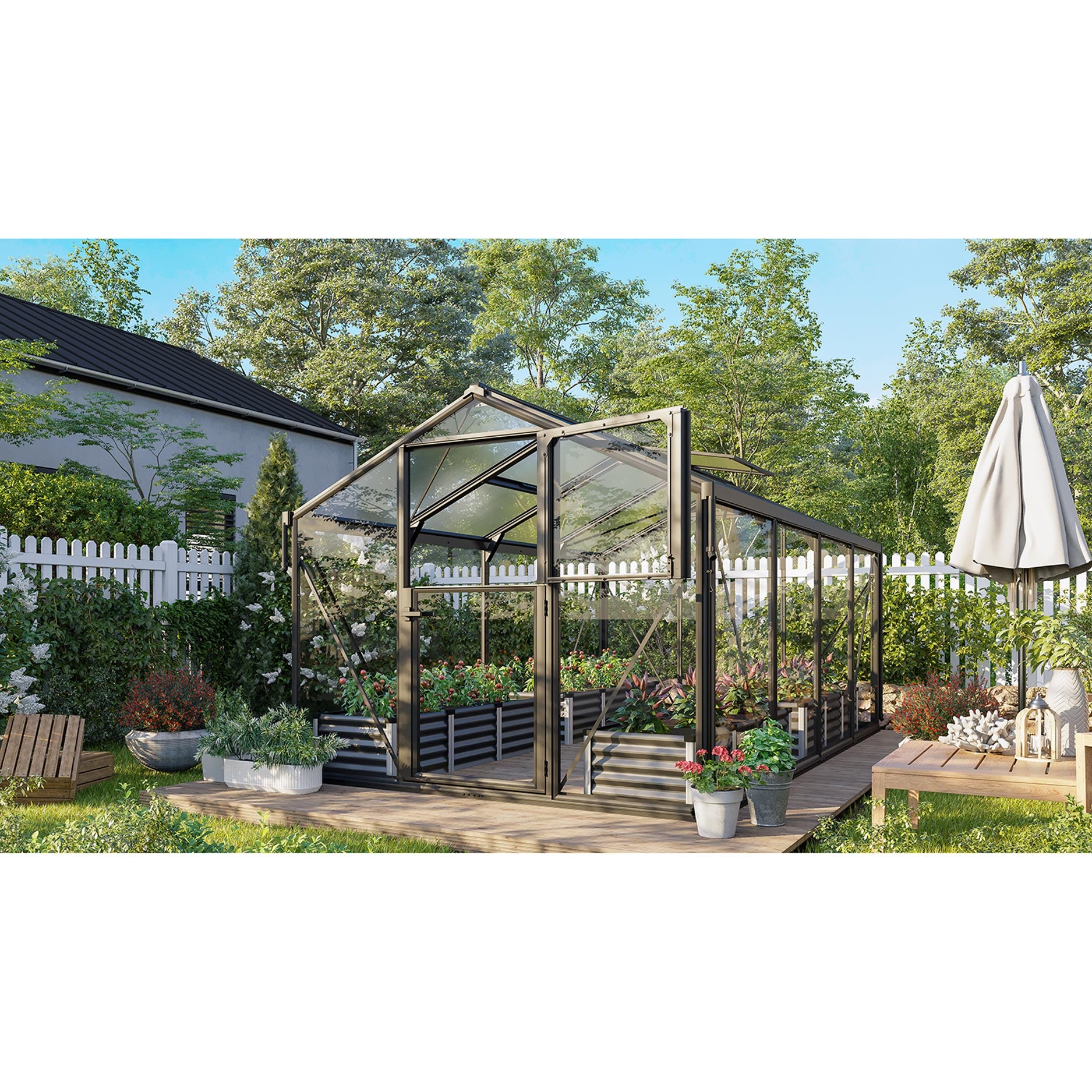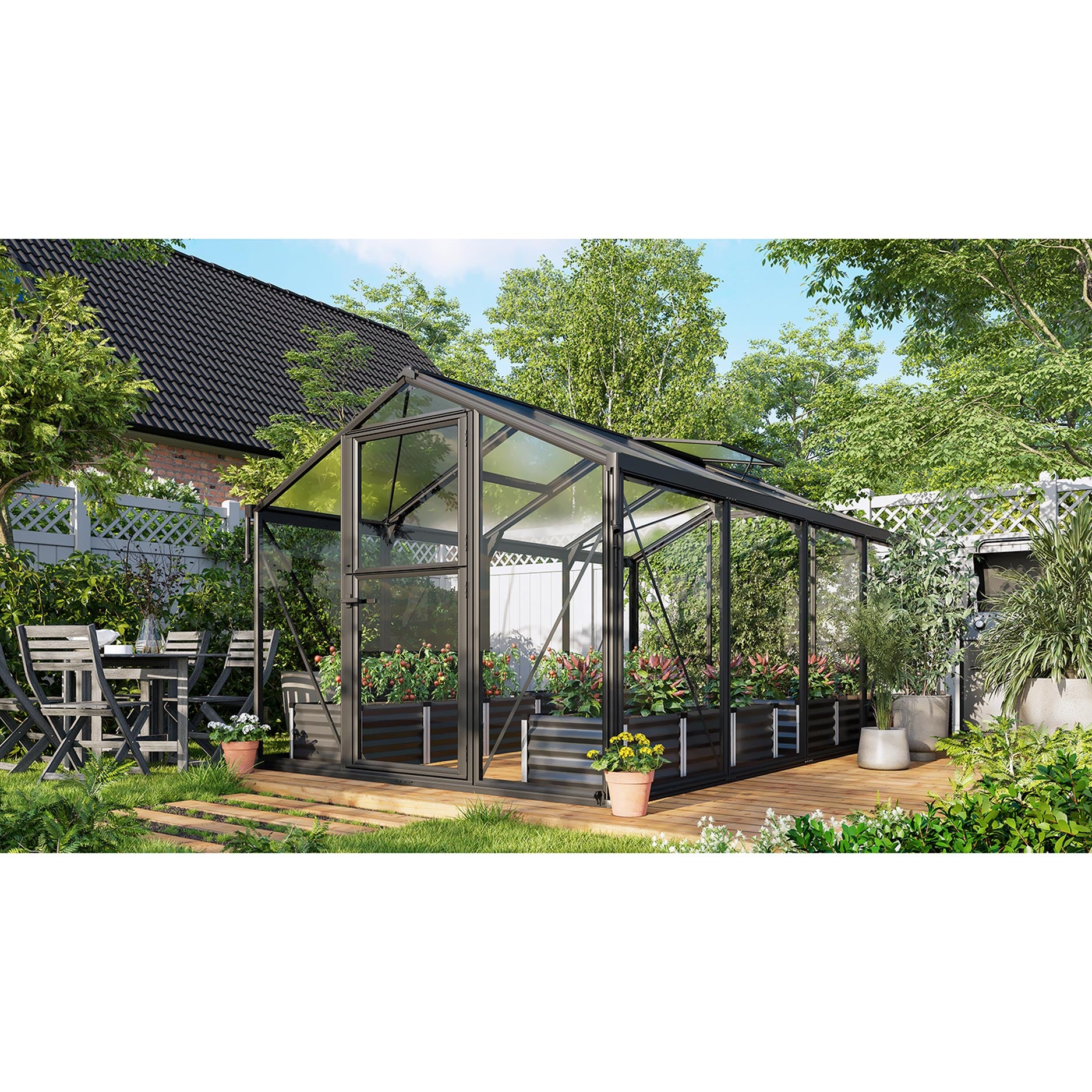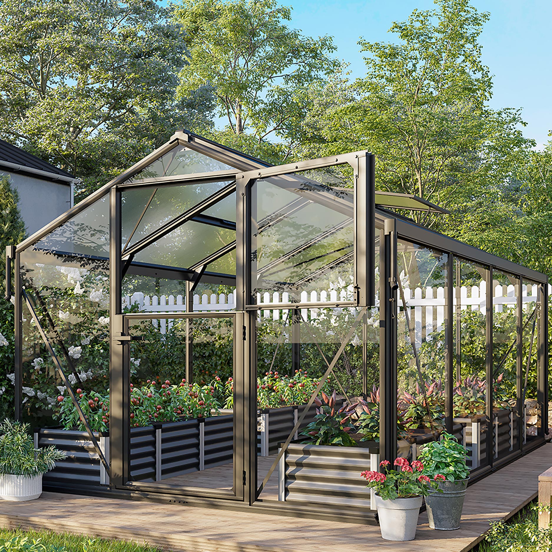Drivhuset er opbygget af en holdbar aluminiumskonstruktion med ekstra forstærkede profiler og en solid kombinationsbeglazning med 10 mm kanalplader i taget og 3 mm sikkerhedsglas i sidevæggene. Denne sammensætning sikrer optimalt lysindfald, et stabilt indeklima og langvarig beskyttelse af dine planter. Ruderne monteres sikkert i aluminiumsrammer, så ophobning af snavs og slid holdes på et minimum. Som standard er drivhuset udstyret med tagrender og nedløbsrør til vandafledning, og den praktiske stalddør giver naturlig ventilation, uden at skadedyr kan komme ind. Med sit gennemtænkte design og sin stærke konstruktion er Deimos 11200 et pålideligt drivhus til mange års glæde i haven.