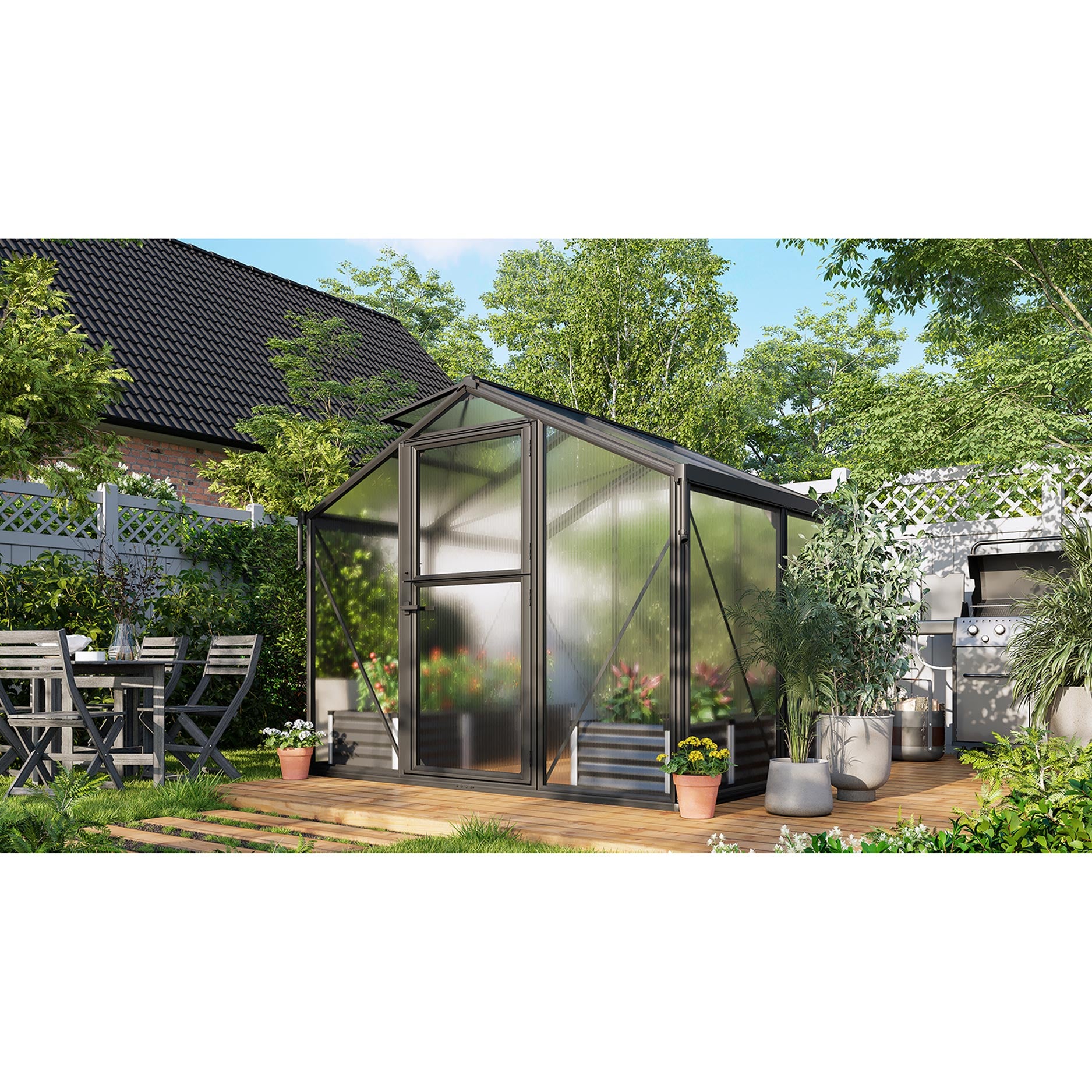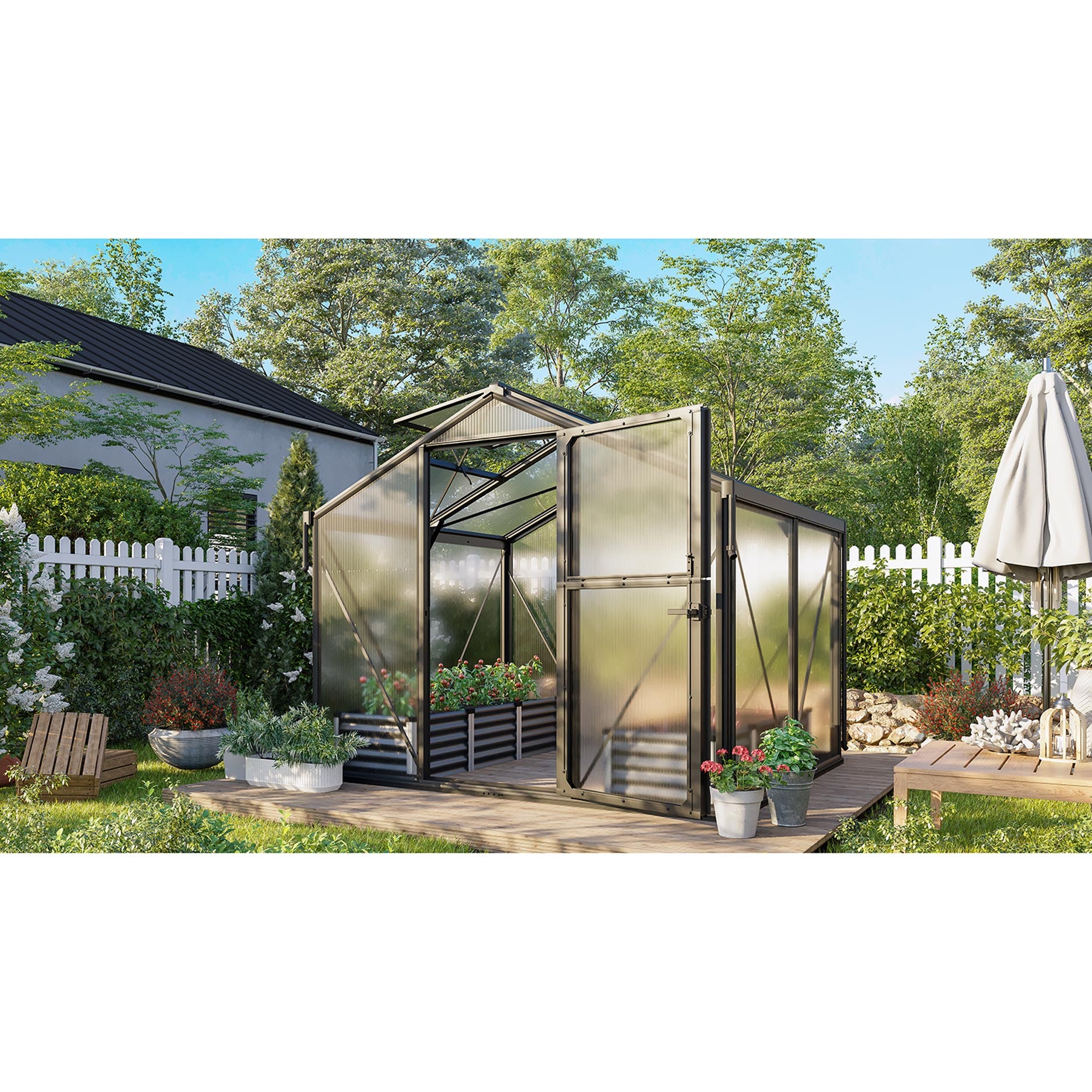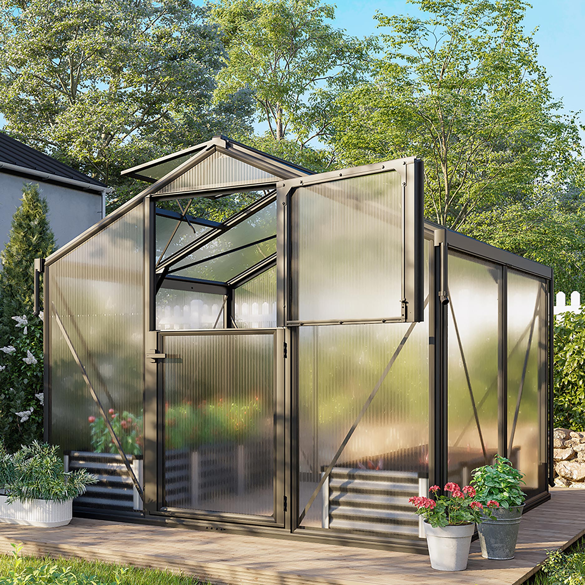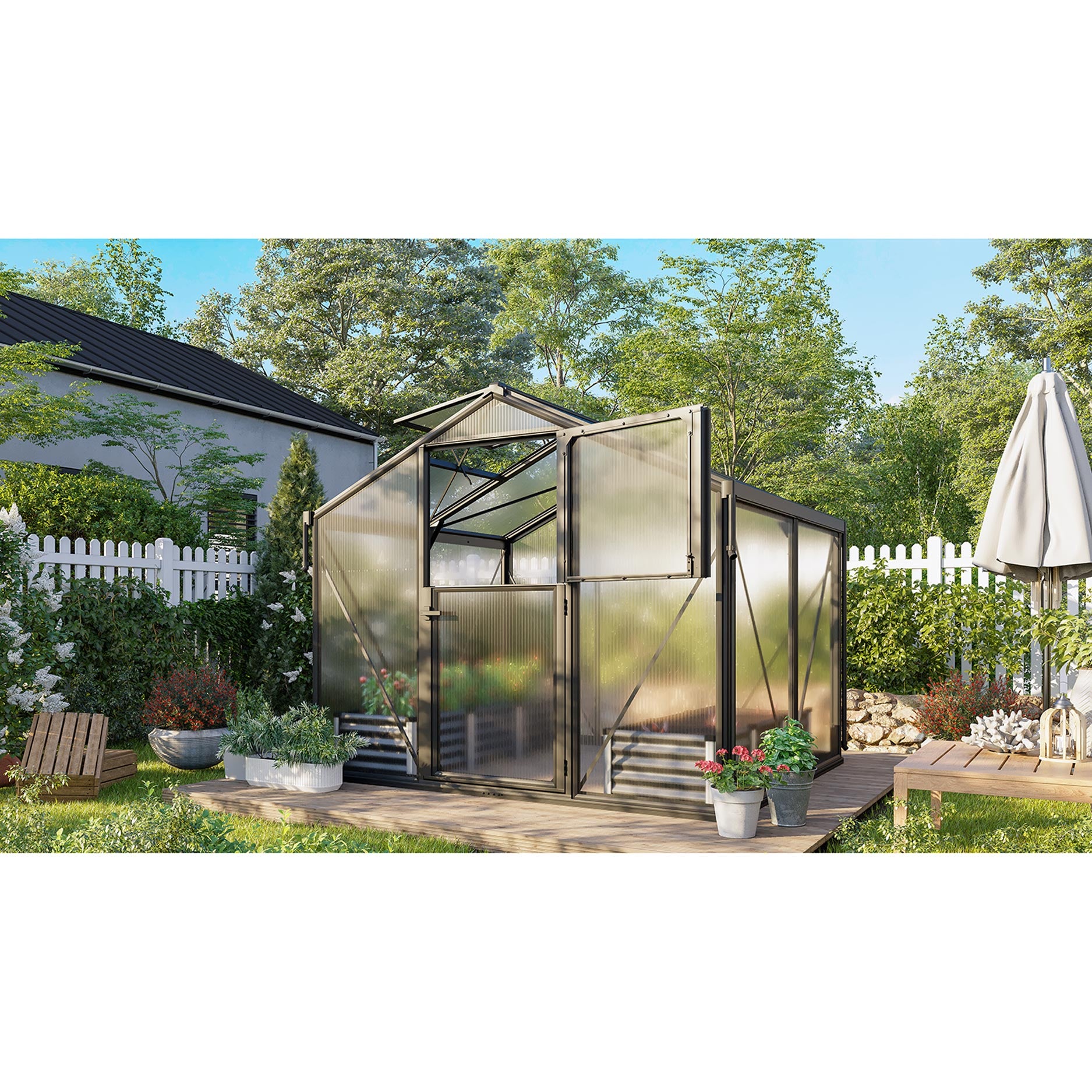 Deimos 5800 er særligt velegnet til haveejeren, der ønsker god plads uden straks at opstille et meget stort drivhus. Med et gulvareal på ca. 5,8 m² giver dette drivhus rigelig dyrkningsplads til grøntsager, frugt og prydplanter, samtidig med at det forbliver kompakt nok til den gennemsnitlige baghave. Takket være den smarte stalddør (øverste og nederste del kan åbnes separat) kan du sørge for ventilation i varmt vejr, uden at uønskede gæster trænger ind i drivhuset. Formen er stram og elegant, hvilket gør dette drivhus til en reel gevinst i enhver have.