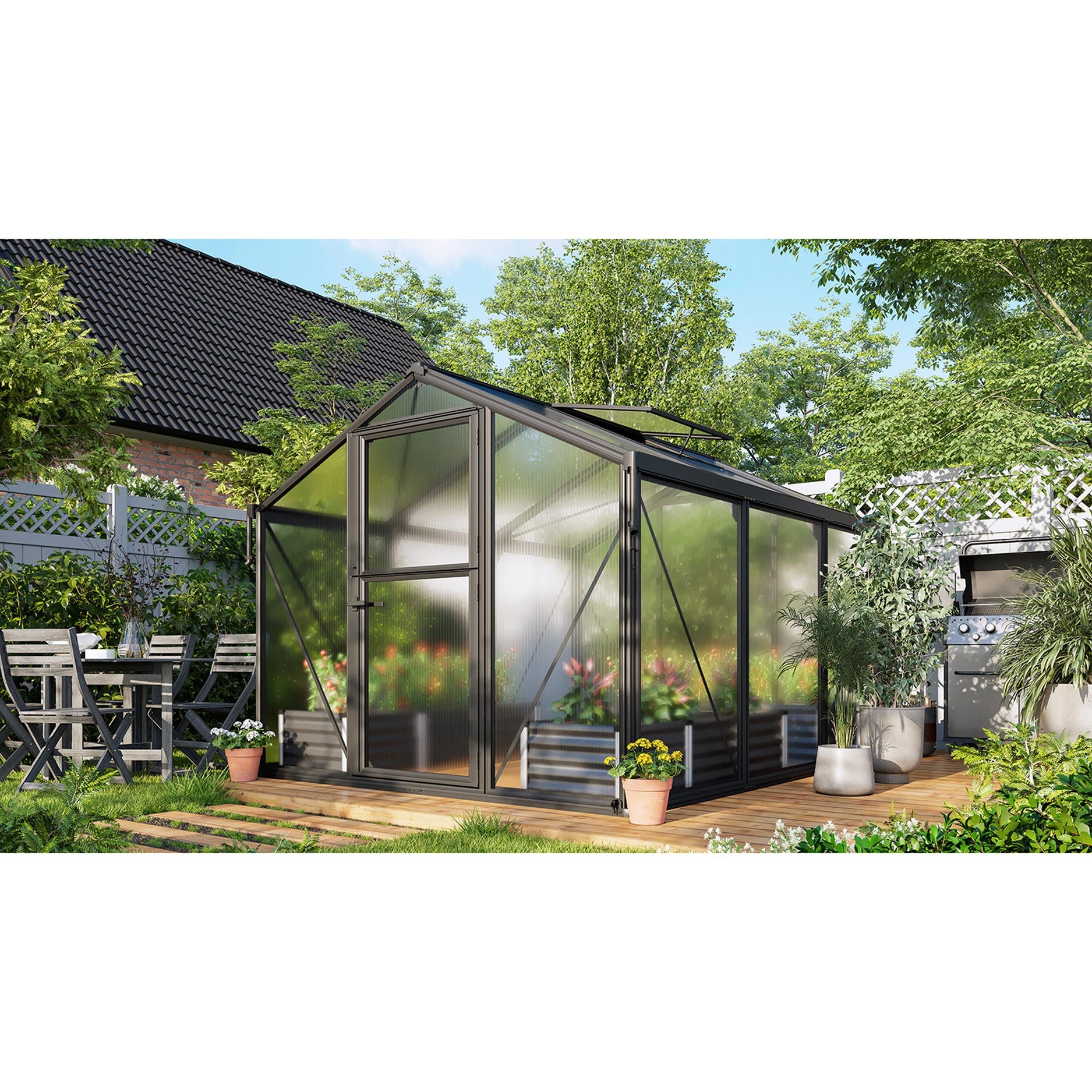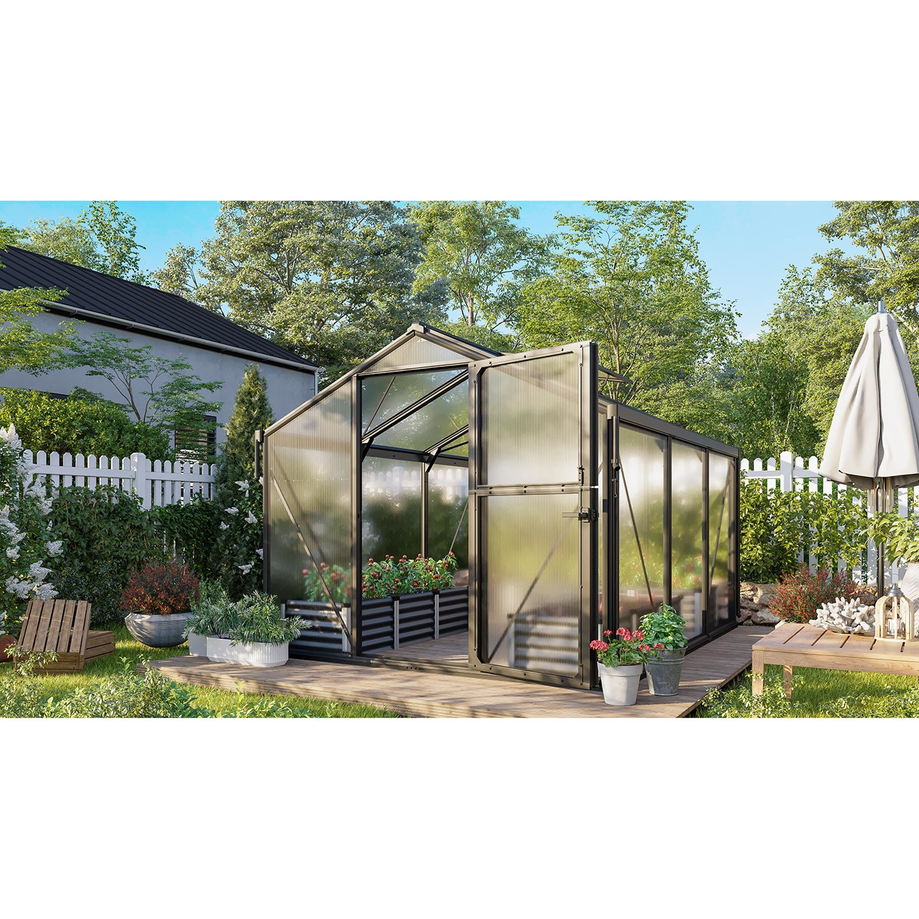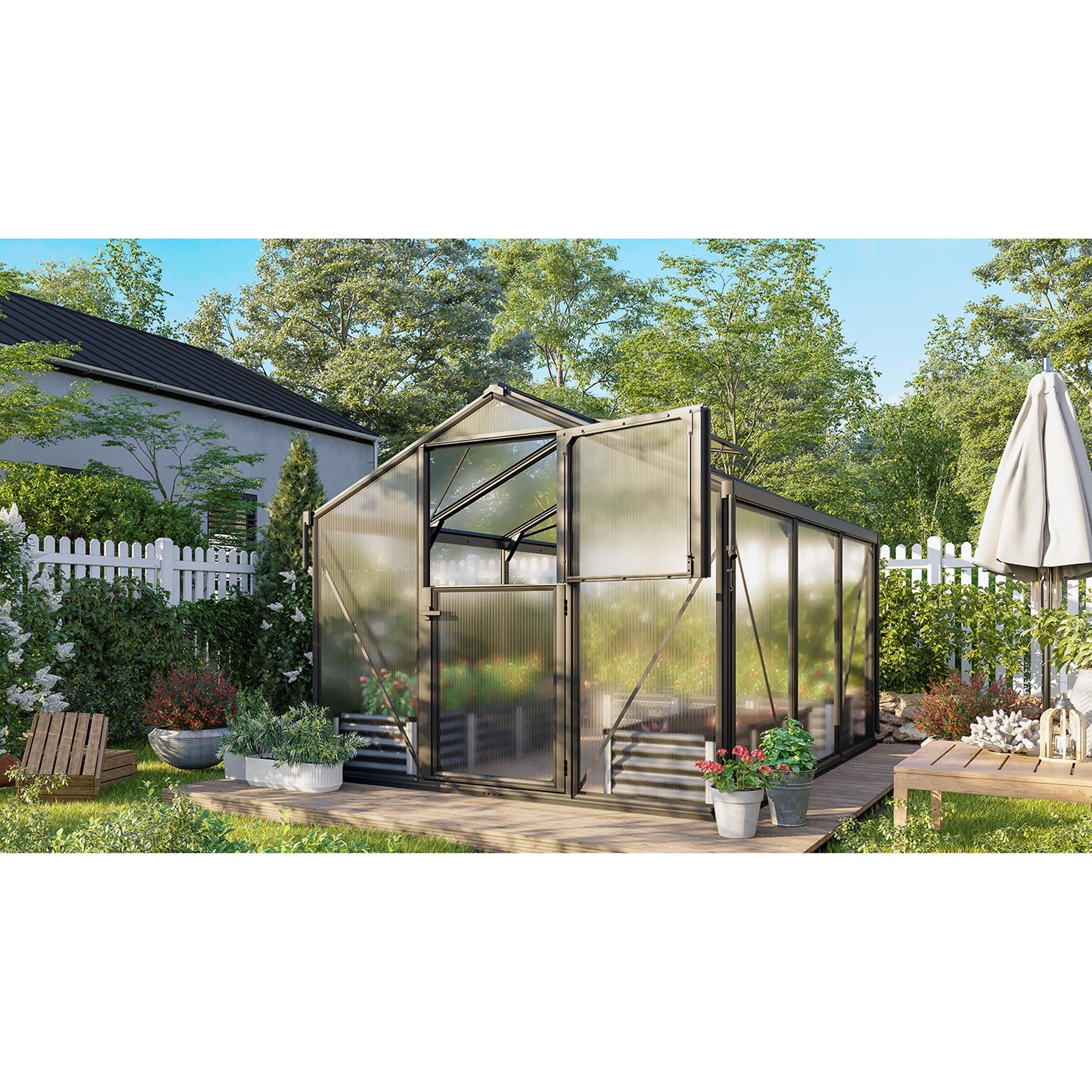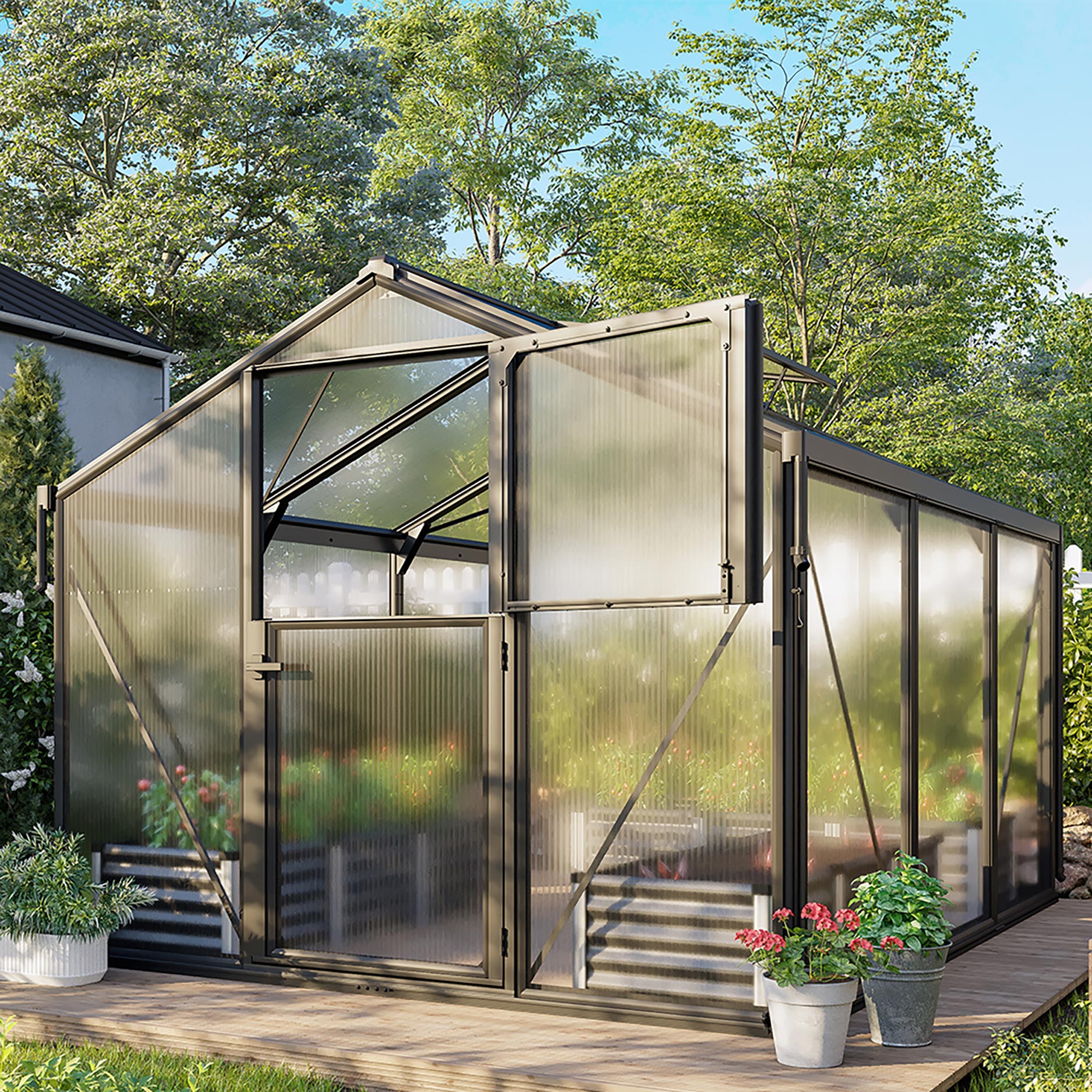 Deimos 8500 er ideel til haveejere, der søger en rummelig model med særlige ventilationsmuligheder. Med 8,5 m² dyrkningsareal og en komfortabel højde kan du have både grøntsager, frugt og prydplanter her. Det, der gør denne model helt særlig, er stalddøren med delt over- og underdel: Du åbner overdelen for frisk luft, mens underdelen forbliver lukket for at holde uønskede gæster ude. Samtidig bevarer det stramme design et stilrent udtryk i haven, mens du får den funktionalitet, du har brug for.