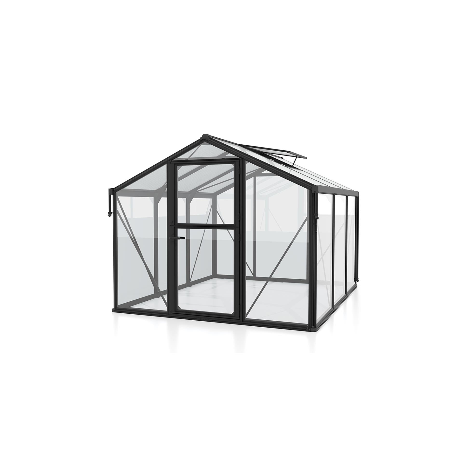Drivhuset har en solid aluminiumskonstruktion, kombineret med en innovativ montering via aluminium klemprofiler: Panelerne klemmes fast mellem lister, hvilket giver kanterne ekstra beskyttelse mod snavs og slid. Glasset er en kombination af 10 mm kanalplade i taget og 3 mm sikkerhedsglas i væggene — en stærk kombination for både lysindfald og stabilitet. Som standard har drivhuset tagrender, nedløbsrør og ét tagvindue, og stalddøren understøtter naturlig ventilation, uden at du behøver at åbne en dør helt.