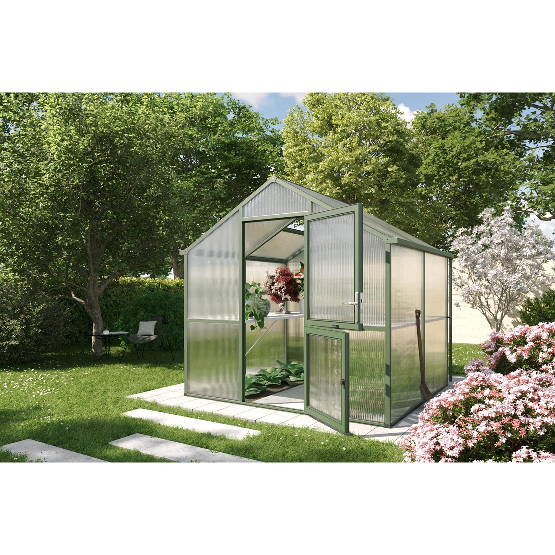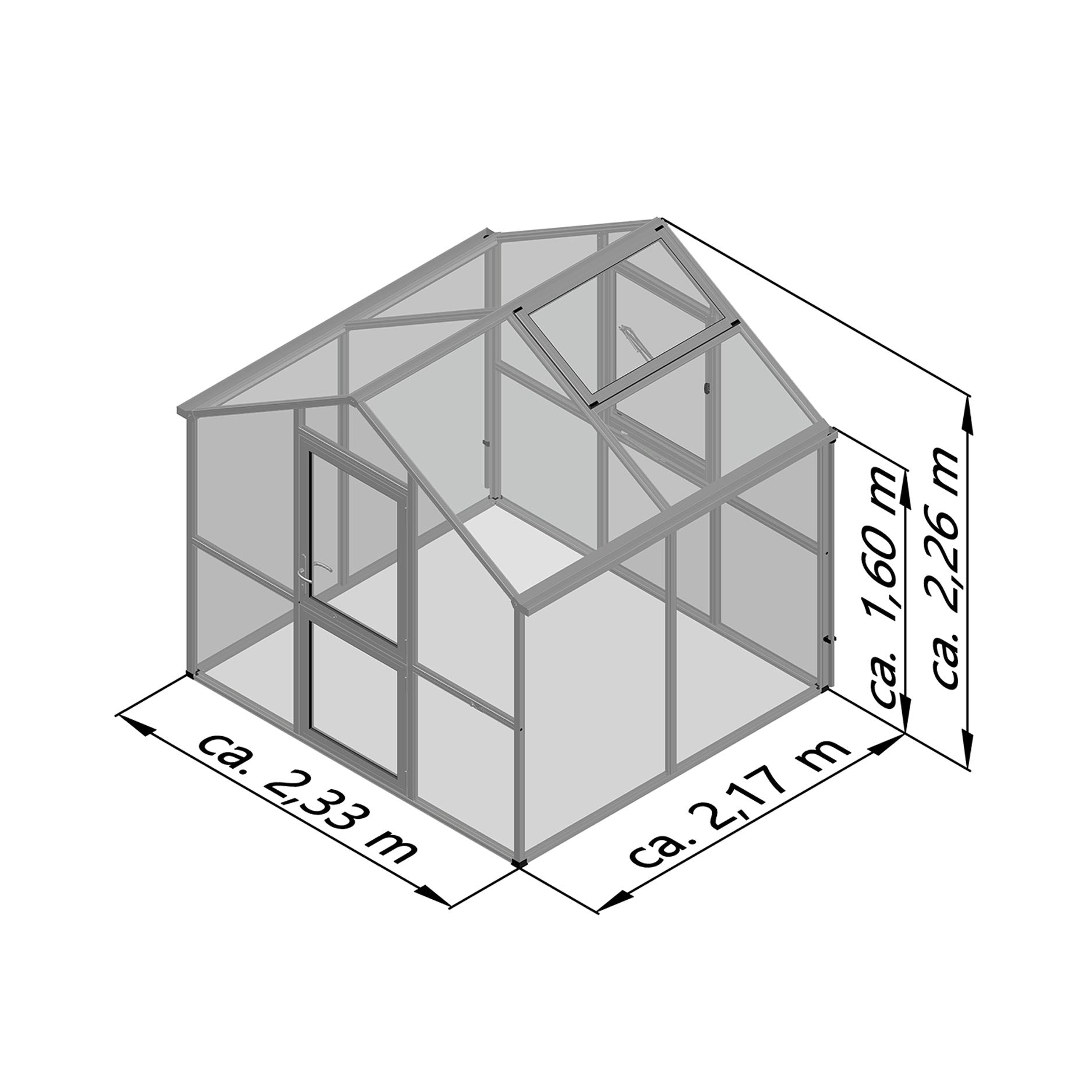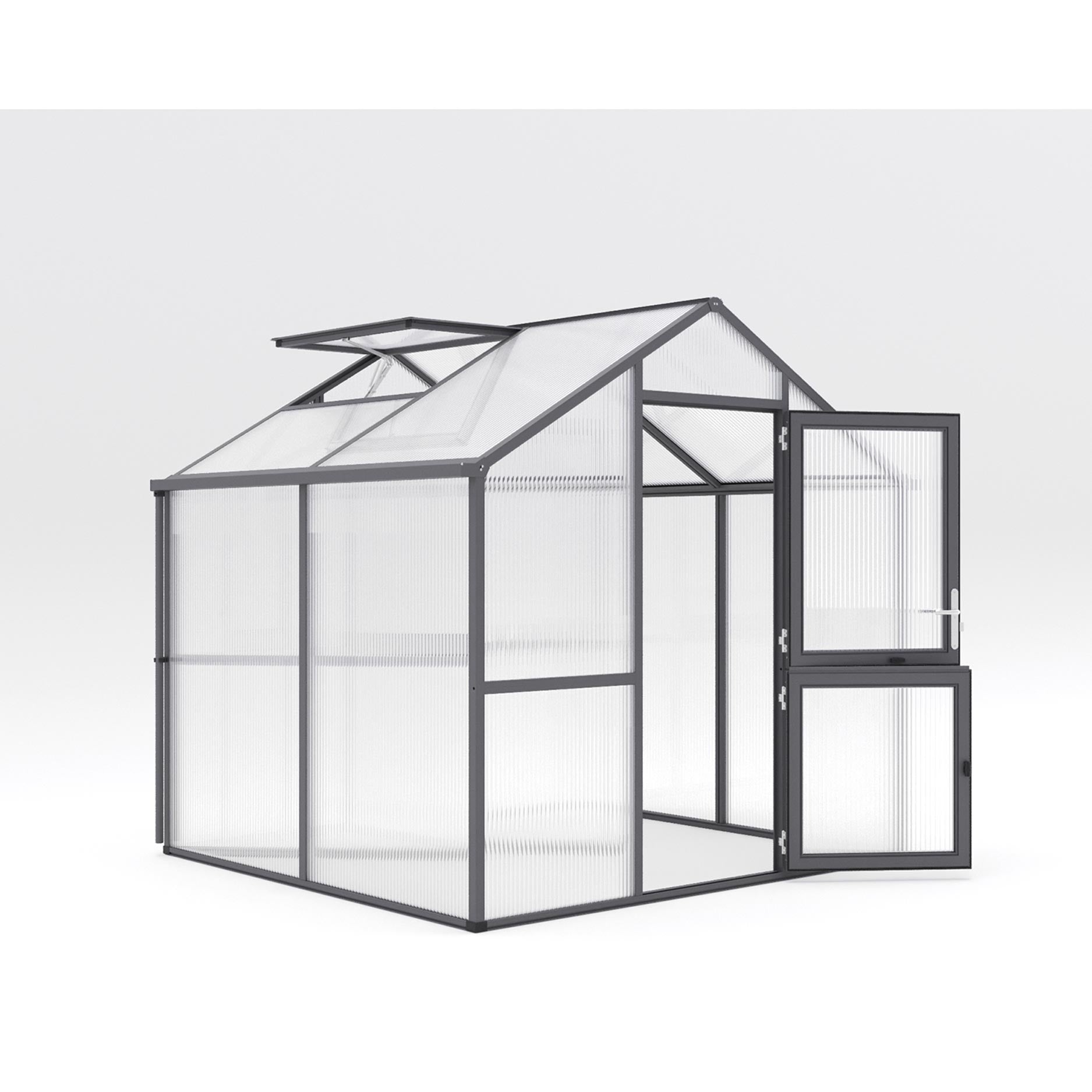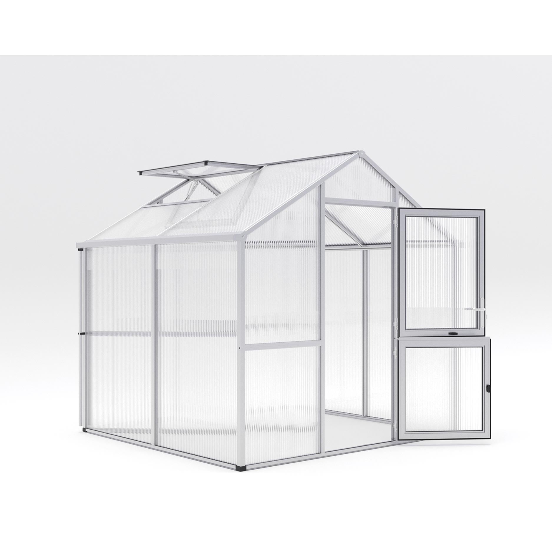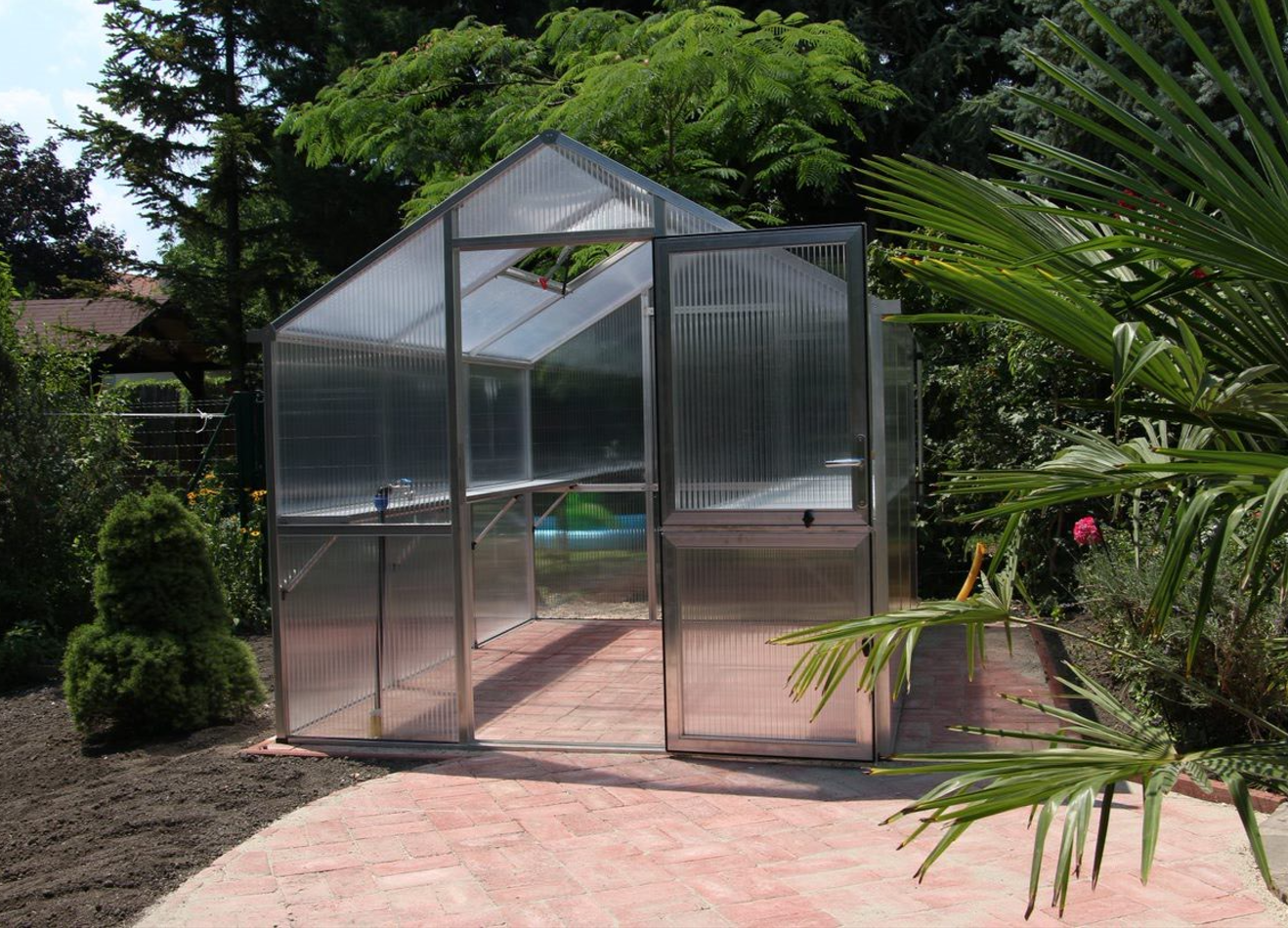 Konstruktionen består af en robust aluminiumsramme med 16mm kanalplader, som sikrer maksimal isolering og lysspredning. Materialet holder på varmen, modvirker kondens og beskytter planterne mod UV-stråling. Drivhuset er udstyret med en bred svingdør, et automatisk tagvindue og integrerede tagrender i begge sider. Med den valgfrie sokkelramme står drivhuset stabilt og i vater, også i kraftig blæst eller på ujævnt underlag.