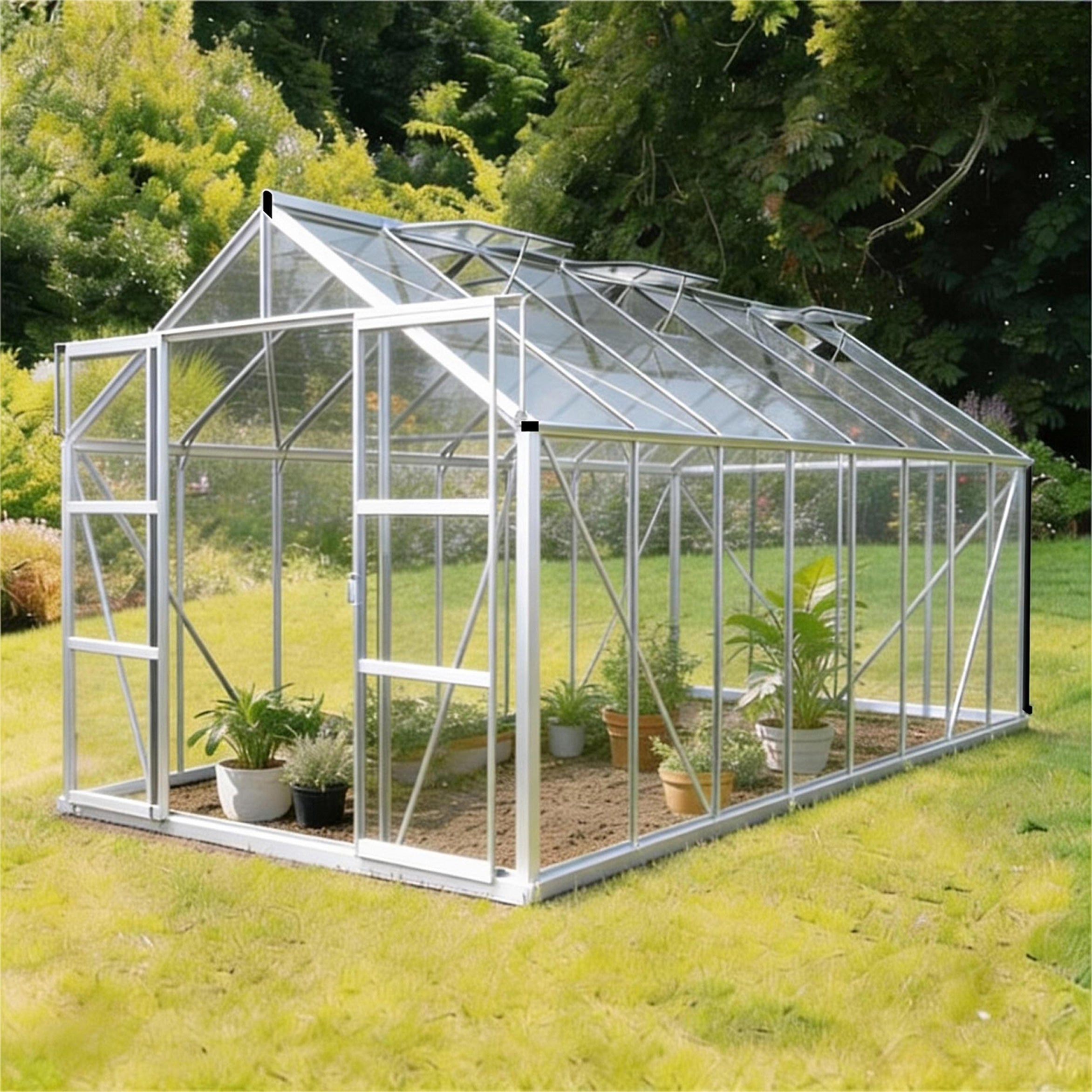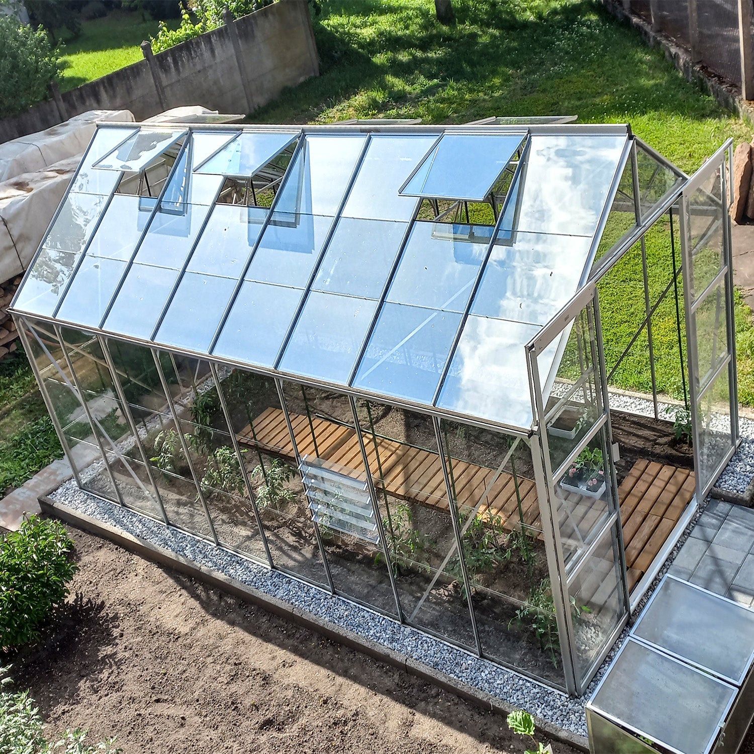 Den robuste aluminiumskonstruktion med sikkerhedsglas giver et stabilt indeklima, selv ved omskifteligt vejr. Den dobbelte skydedør giver en bred passage, og de seks tagvinduer gør udluftning enkel. Takket være fundamentrammen og regnvandsafløbet er dette drivhus fuldt udstyret til mange års haveglæde.