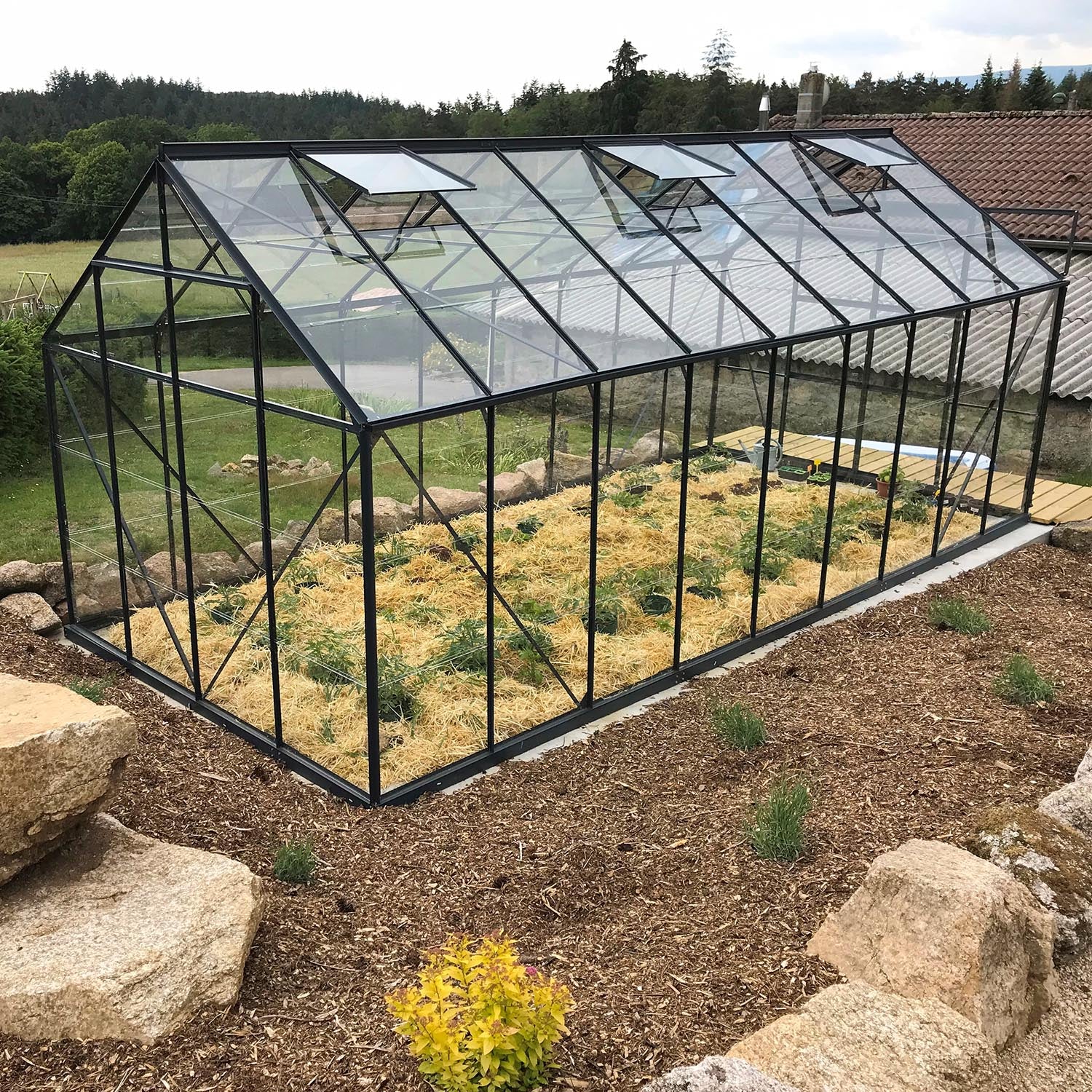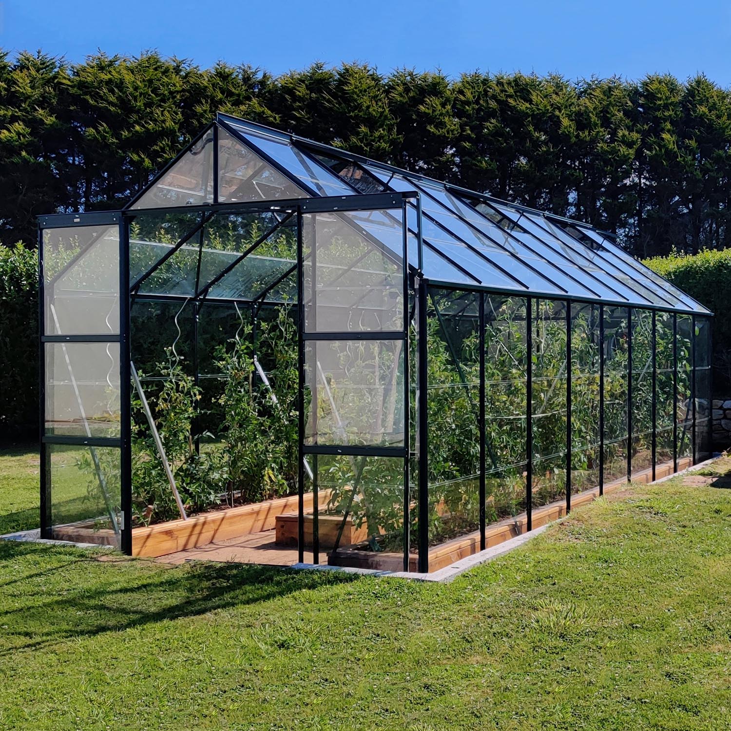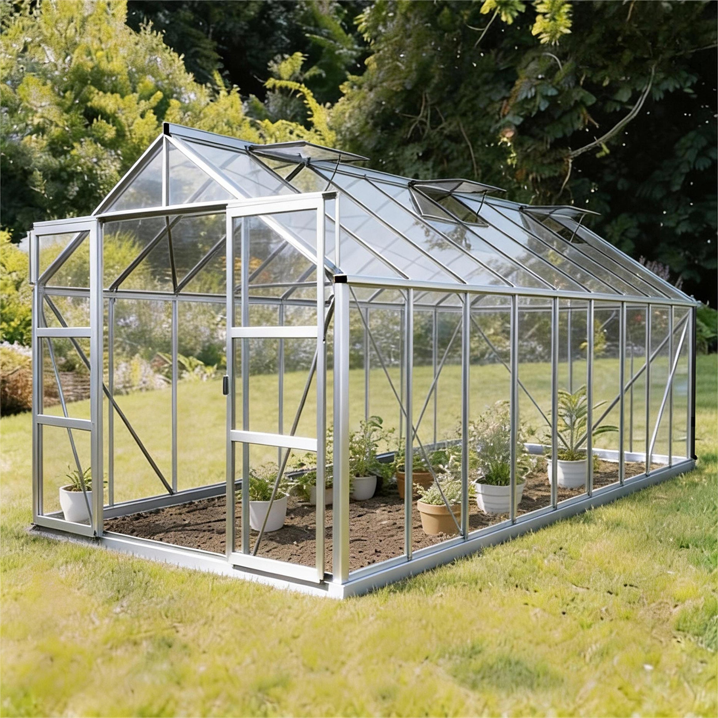 Aluminiumskonstruktionen med sikkerhedsglas garanterer stabilitet og klarhed, mens den dobbelte skydedør og seks tagvinduer muliggør optimal ventilation. Tagrendesystemet gør opsamling af regnvand enkelt og bæredygtigt. Sammen med fundamentrammen udgør det et solidt grundlag til mange års intensiv brug.