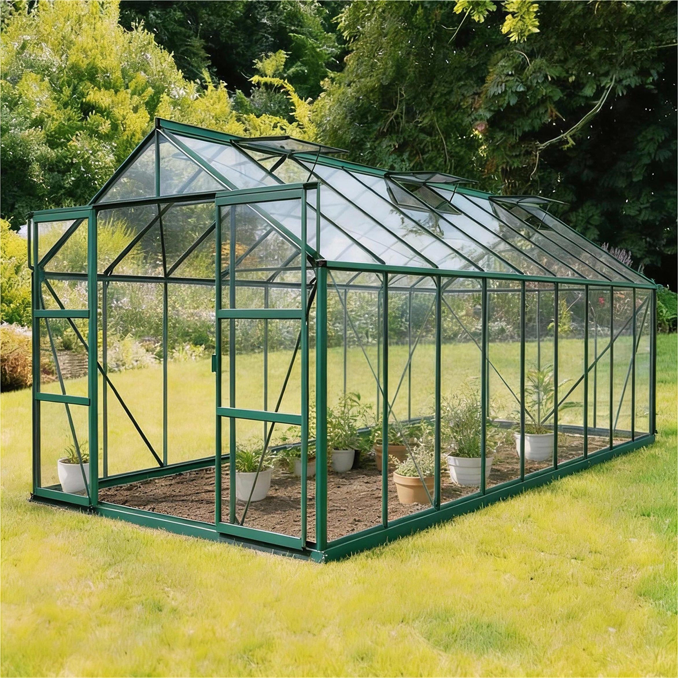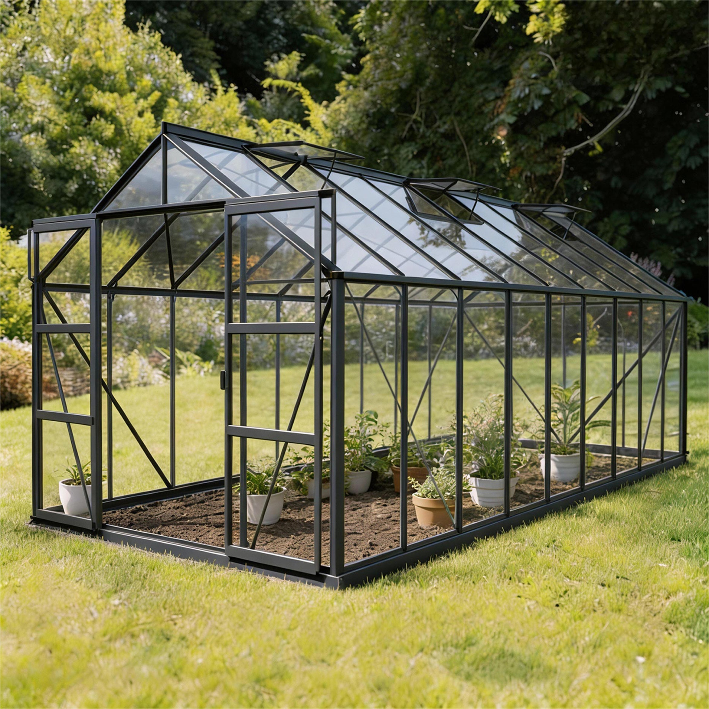 🟩 Ekstra rummeligt drivhus med seks tagvinduer og dobbelt skydedør