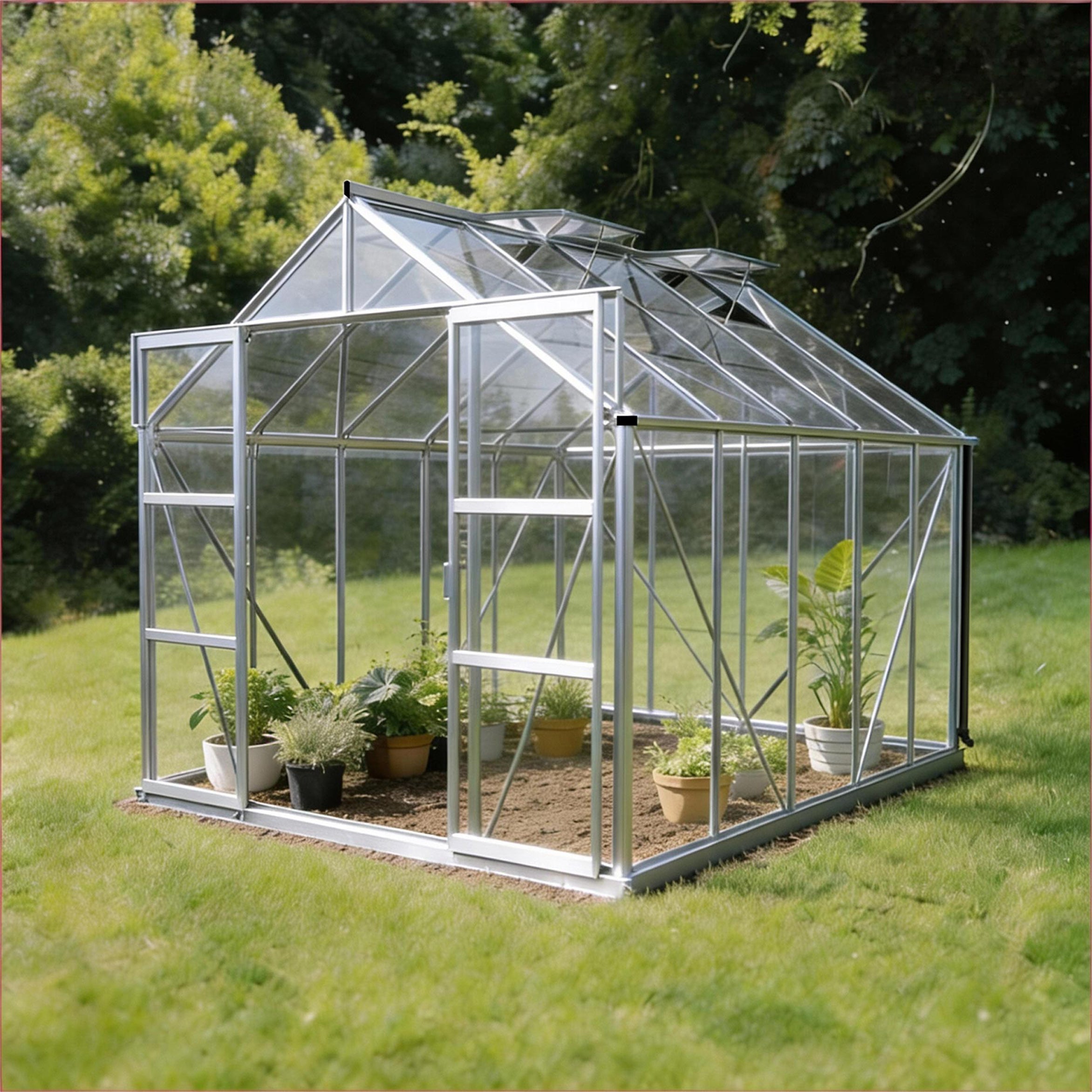 Aluminiumkonstruktionen med sikkerhedsglas sikrer stabilitet og et klart dyrkningsklima. Den dobbelte skydedør gør passagen rummelig og let tilgængelig, mens de fire tagvinduer sørger for frisk luft og temperaturregulering. Fundamentrammen og tagrende til regnvand er inkluderet som standard, så drivhuset kan holde i mange år med minimal vedligeholdelse.
