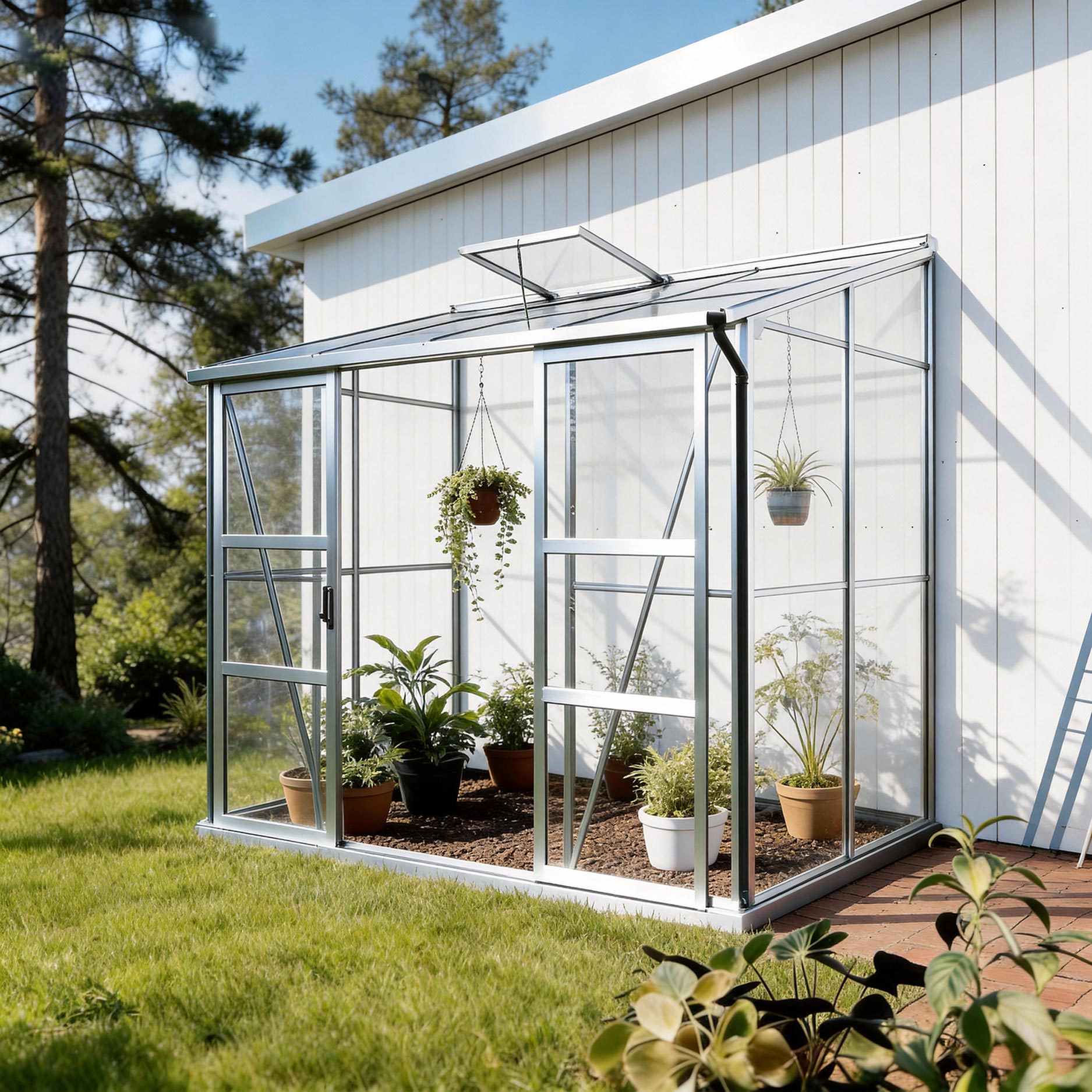 Aluminiumskonstruktionen med sikkerhedsglas er stabil, kræver minimal vedligeholdelse og sikrer et stort lysindfald. Skydedøren og tagvinduet gør udluftning enkel, mens tagrendeafløbet leder regnvandet pænt væk. Takket være fundamentsrammen står drivhuset solidt og pålideligt, så De kan nyde sund vækst sæson efter sæson.