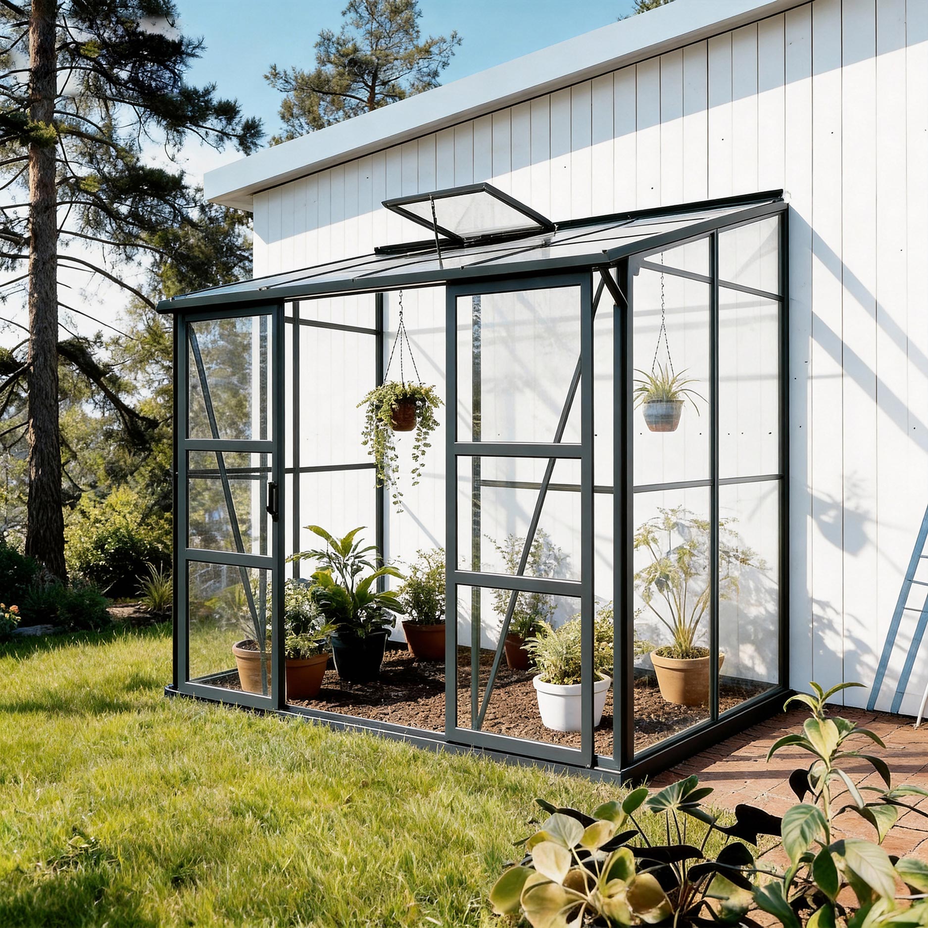🟩 Solidt vægdrivhus med skydedør og tagvindue