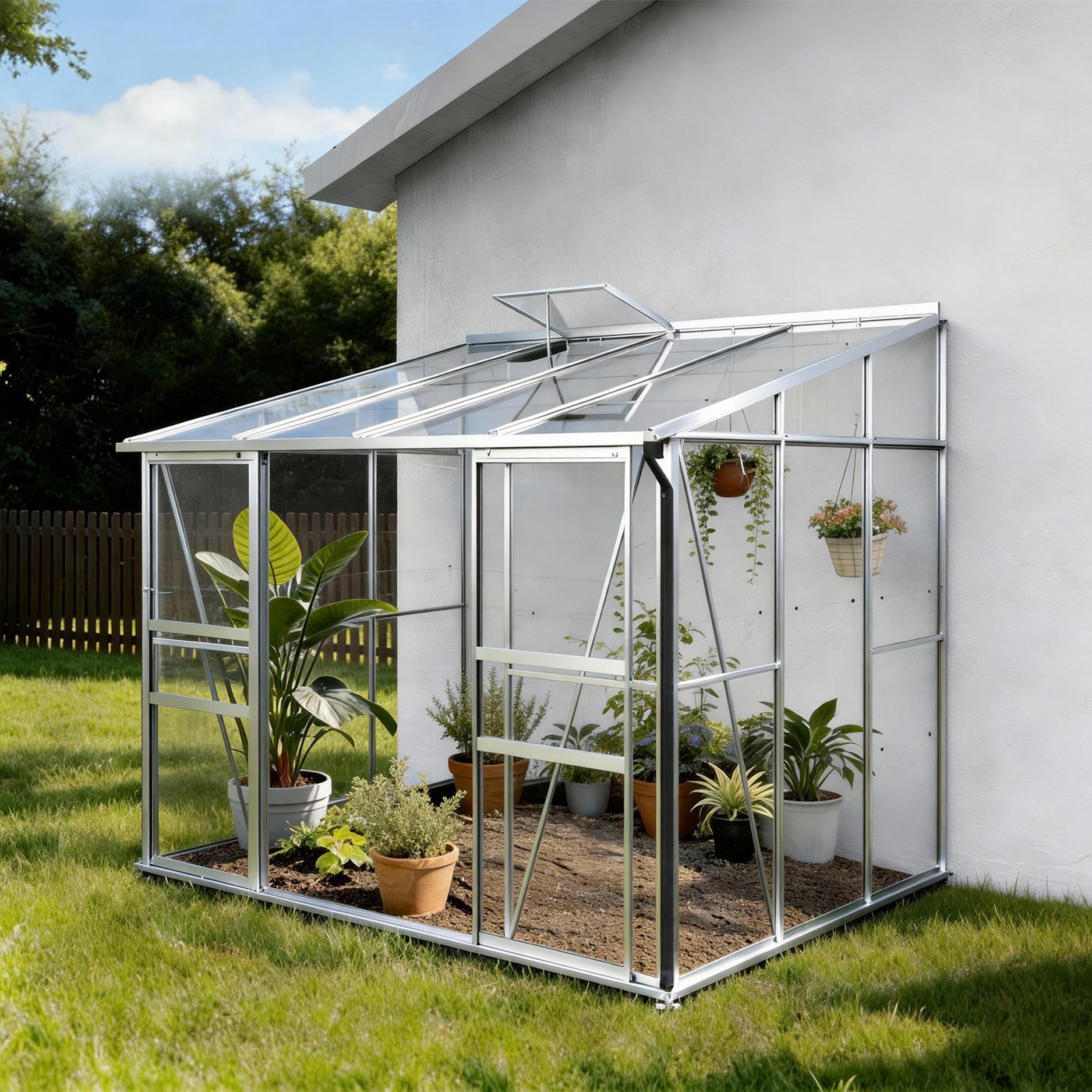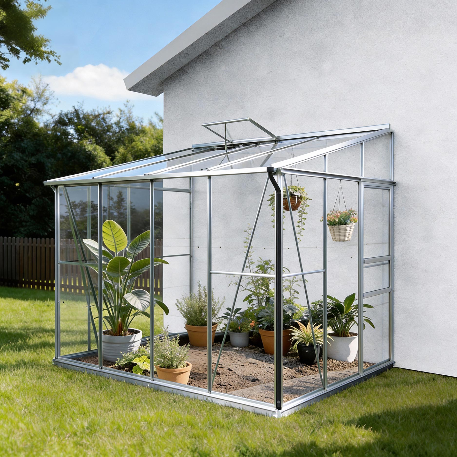 Aluminiumskonstruktionen med sikkerhedsglas sikrer stabilitet og lysindfald. Skydedøren og tagvinduet holder indeklimaet behageligt, mens tagrende og nedløb leder regnvandet effektivt væk. Takket være sokkelrammen står drivhuset solidt, også i blæst eller regn.