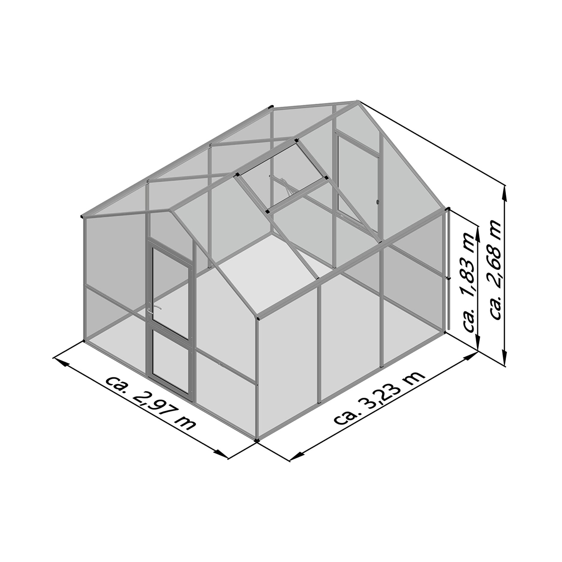 Konstruktionen består af en stærk, vedligeholdelsesfri aluminiumskonstruktion med 10 mm kanalplader, der sikrer fremragende isolering og lysfordeling. Pladerne er UV-beskyttede, så de forbliver klare i mange år, og dine planter ikke svides i stærk sol. Takket være den gode isoleringsværdi forbliver temperaturen inde længere stabil, hvilket forlænger vækstsæsonen betydeligt. Drivhuset er udstyret med en bred slagdør, et tagvindue med automatisk åbner og et manuelt bagvindue til luftcirkulation. Tagrender på begge sider leder nedbør væk eller muliggør tilslutning til et opsamlingssystem. Med den valgfrie fundamentramme står drivhuset solidt forankret, også ved vindbelastning eller blød undergrund.