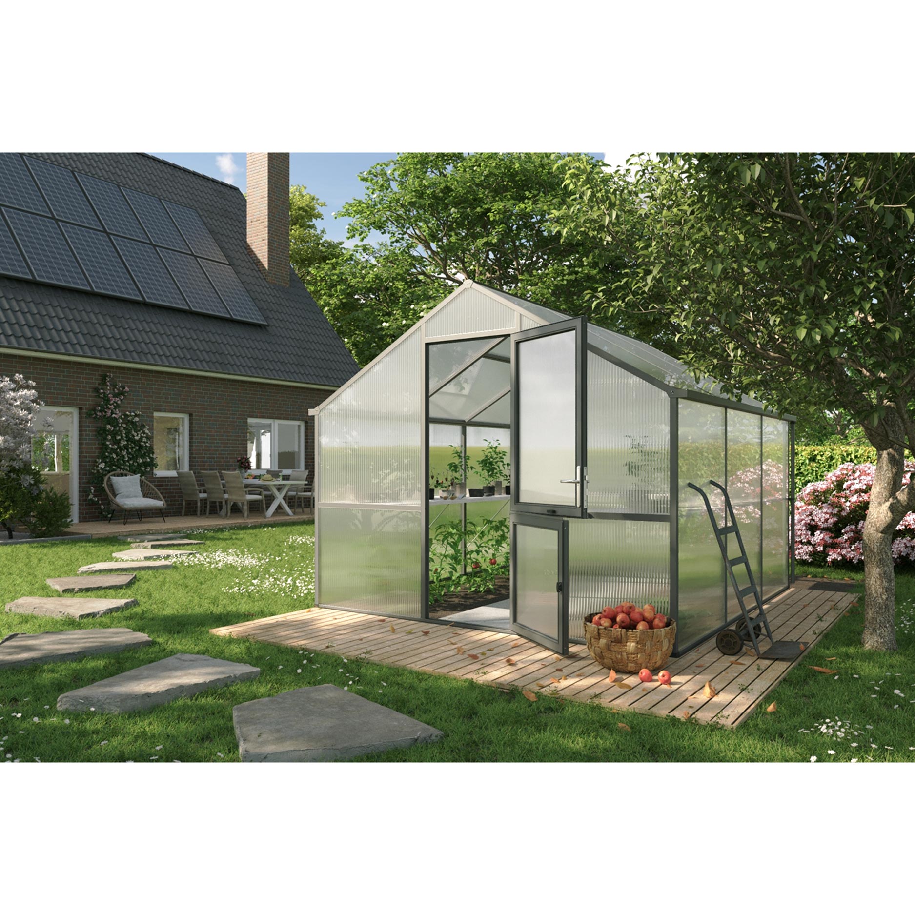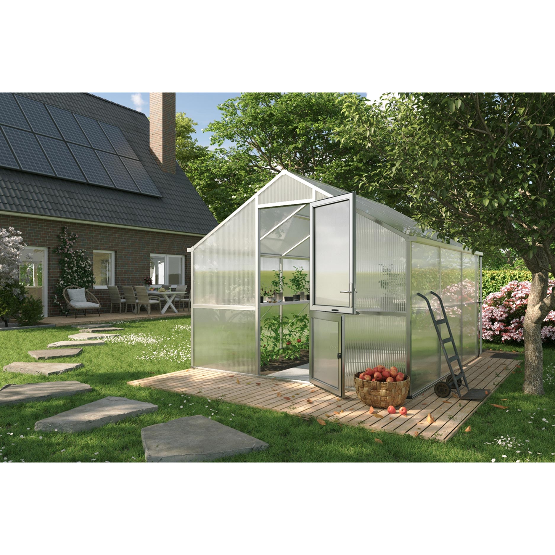 Konstruktionen består af en stærk aluminiumsbase med 16mm kanalplader, som isolerer usædvanligt godt og fordeler lyset jævnt. Det begrænser temperatursvingninger og forebygger svidning af afgrøder. Nelke III er udstyret med en bred drejedør, et automatisk tagvindue og et manuelt bagvindue til naturlig ventilation. Integrerede tagrender leder vand effektivt væk eller kan kobles til et opsamlingssystem. Med den valgfrie fundamentsramme står drivhuset stabilt og i vater, også i hård vind.