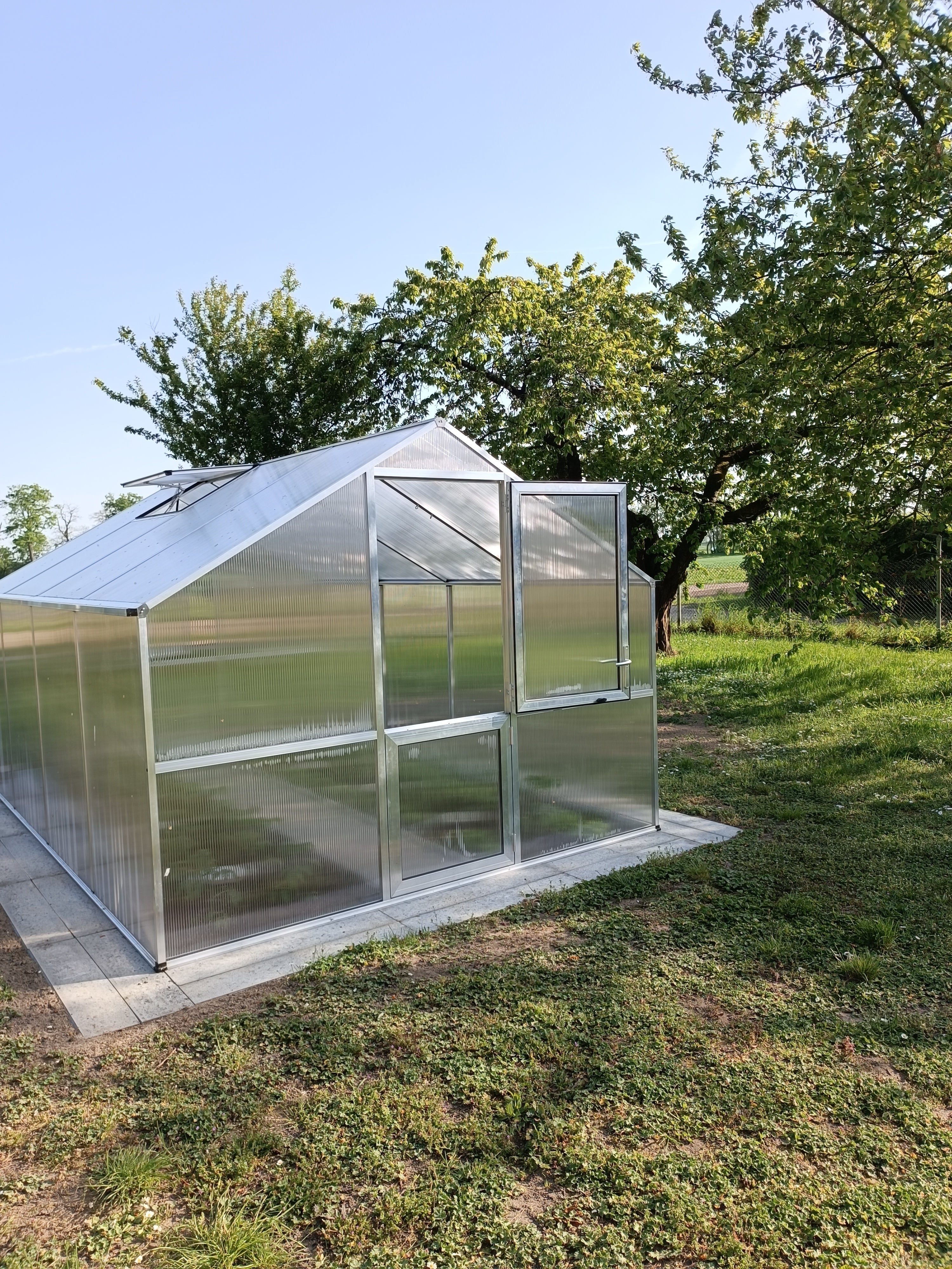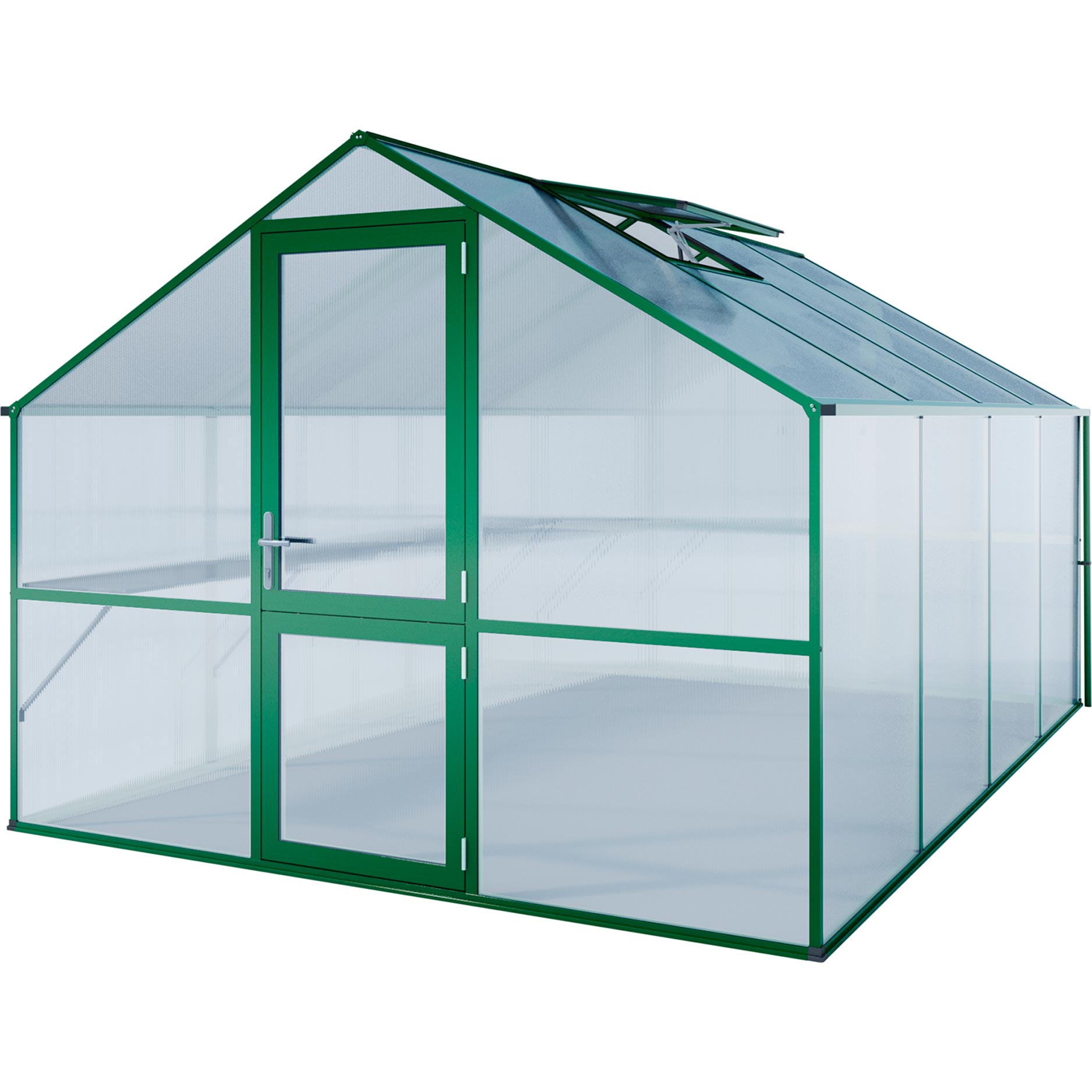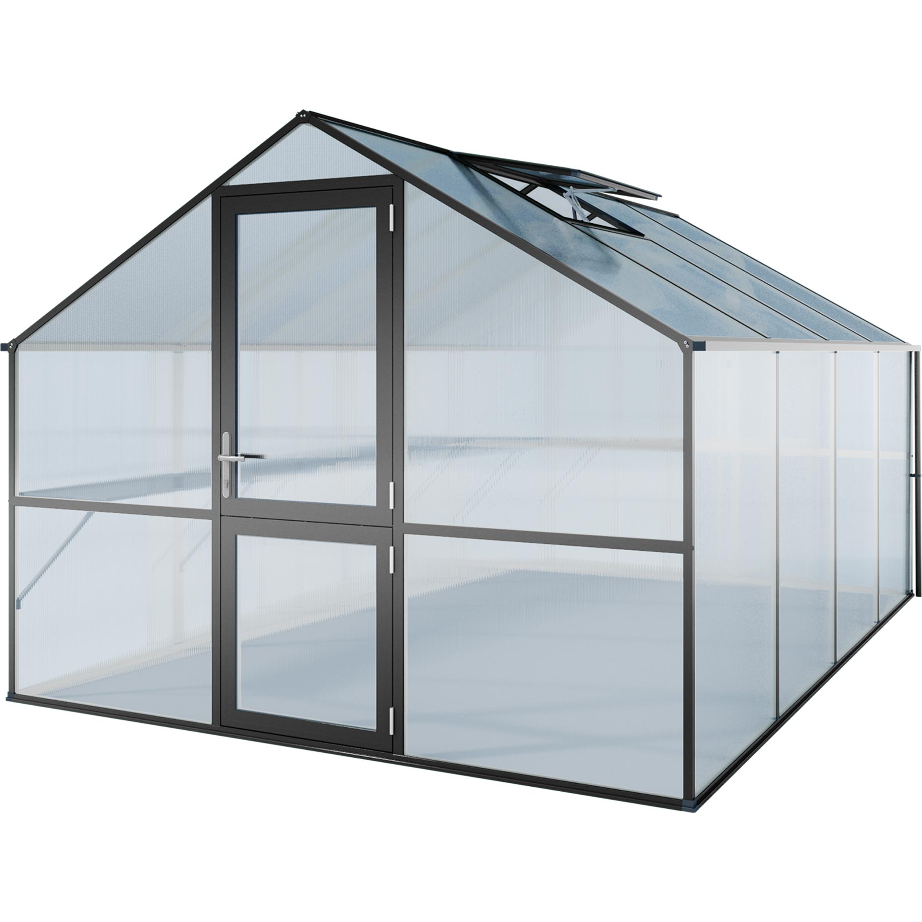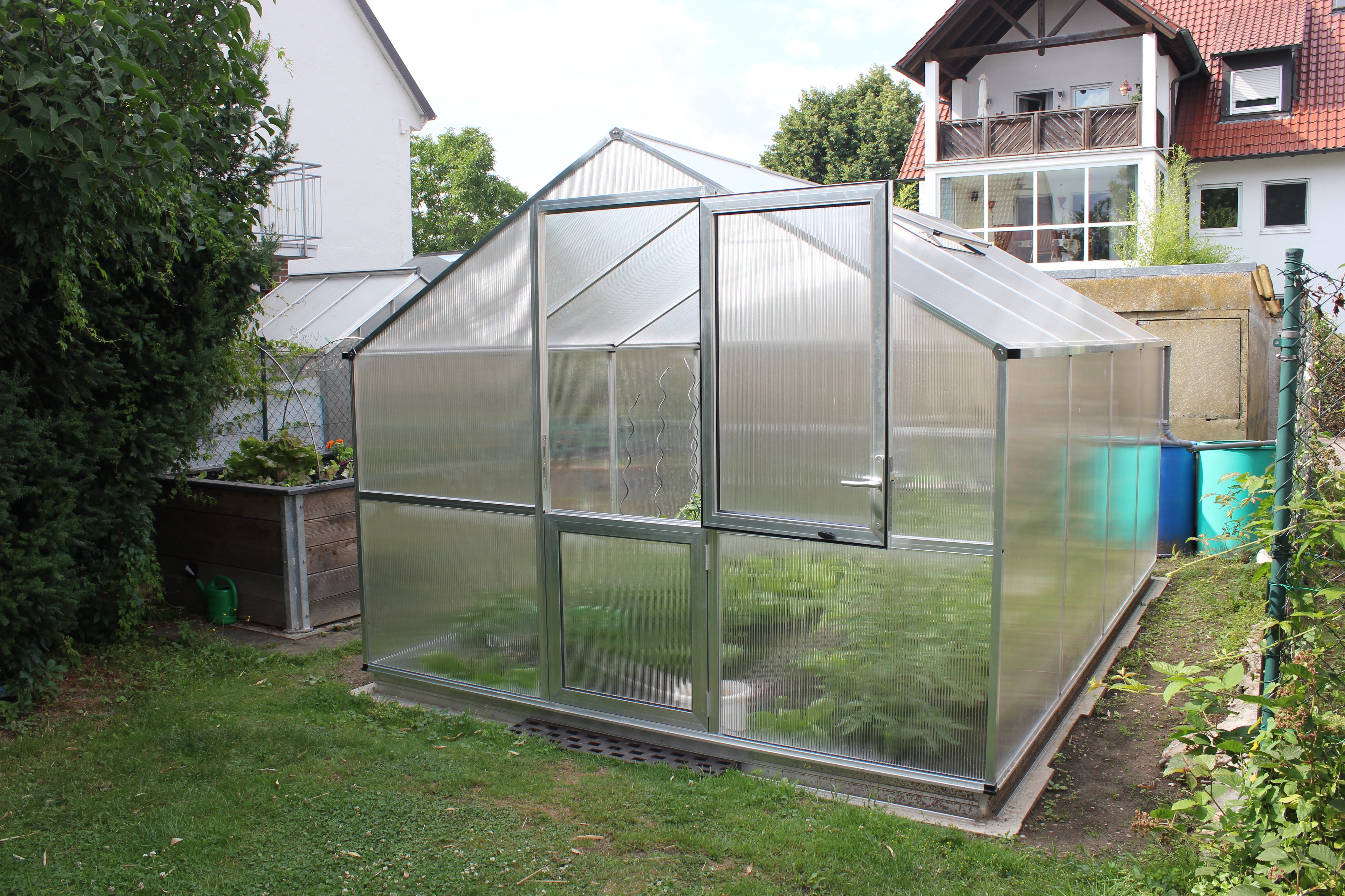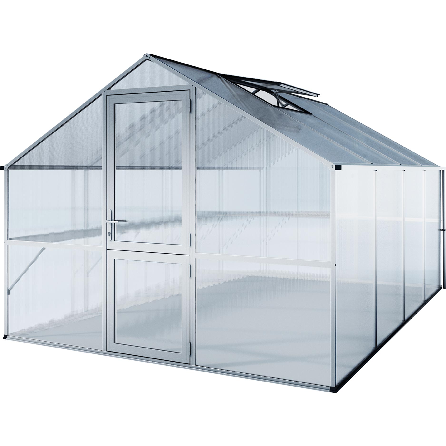 Aluminiumrammen garanterer maksimal stabilitet og lang levetid. Beklædningen består af 10 mm kanalplader, som sikrer fremragende isolering, lysspredning og beskyttelse mod UV-stråling. Det giver en jævn temperatur, også ved kraftigt skiftende vejrforhold. Drivhuset er udstyret med en bred slagdør, et automatisk tagvindue og et manuelt bagvindue til kontrolleret ventilation. De dobbelte tagrender med afløb på begge sider gør det nemt at opsamle regnvand. Med den valgfrie fundamentramme står drivhuset urokkeligt, selv i hård blæst.