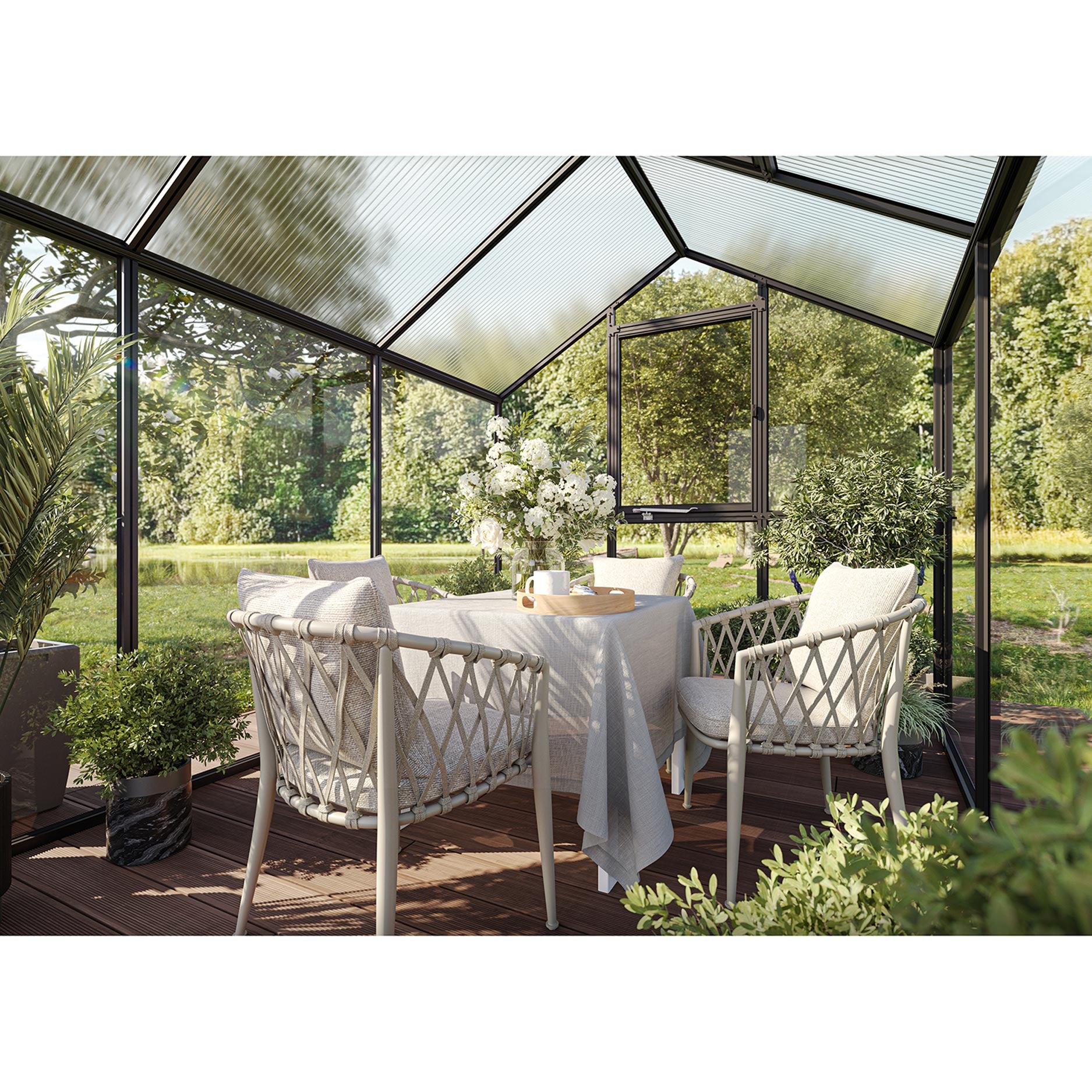 Drivhuset er opbygget af en robust aluminiumskonstruktion med 4mm sikkerhedsglas i sidevæggene og 10mm kanalplader i taget. Denne kombination giver klart udsyn og fremragende isolering. Ortasia III er udstyret med en bred drejedør med lås, et automatisk tagvindue og et manuelt bagvindue for optimal ventilation. Integrerede tagrender med regenrør i aluminium sikrer effektiv vandafledning. Den valgfrie fundamentsramme garanterer en stabil placering og forlænger drivhusets levetid.