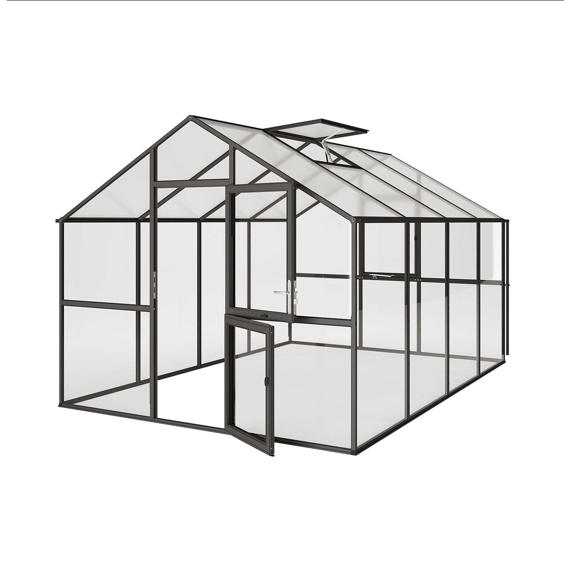 Aluminiumskonstruktionen er særligt solid og modstandsdygtig over for stor belastning. Væggene består af 4mm sikkerhedsglas, taget af 10mm kanalplader med UV-beskyttelse. Denne kombination giver maksimal lysindfald uden varmeopbygning. Drivhuset er udstyret med en bred drejedør med lås, to tagvinduer (hvoraf ét automatisk), et manuelt bagvindue samt dobbelte tagrender med nedløbsrør. Den valgfrie fundamentramme giver ekstra stabilitet og holdbarhed.