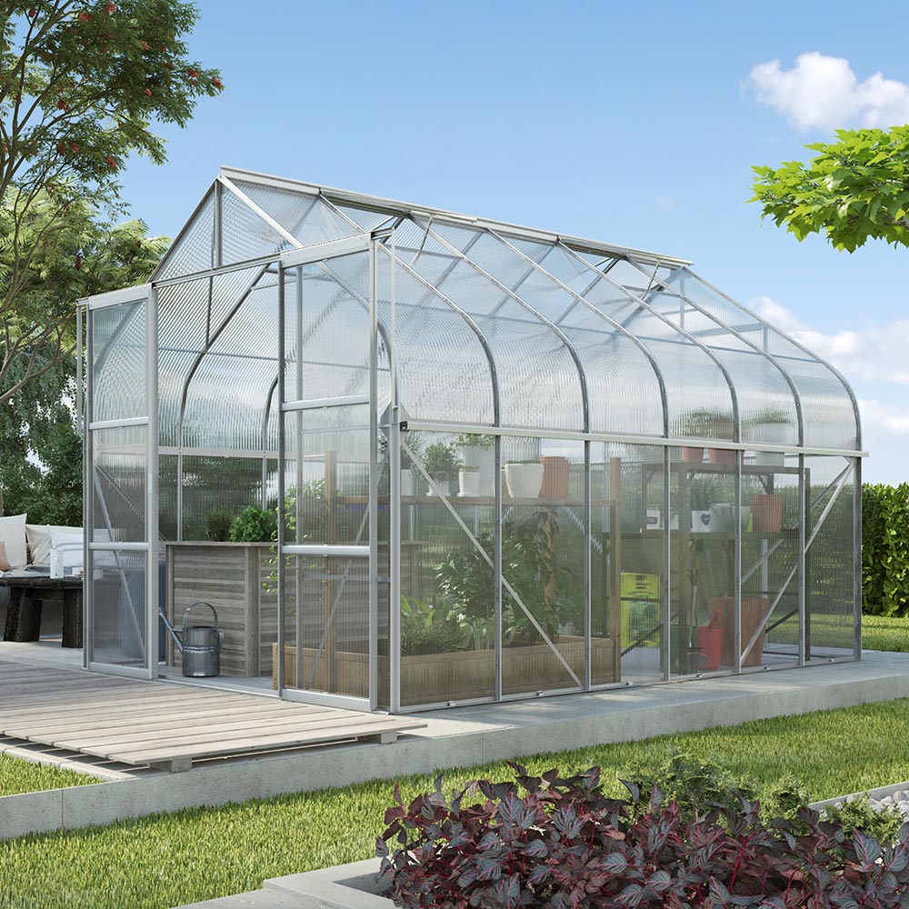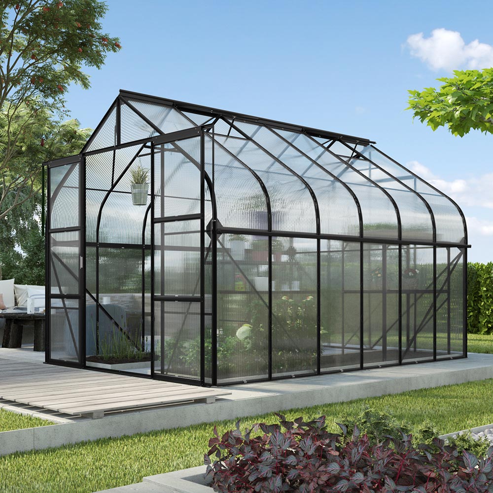 De serie omvat vijf modellen tussen 4,6 m² en 11,5 m², ideaal voor wie een ruimere, stijlvollere kas zoekt die nog altijd eenvoudig te plaatsen is.