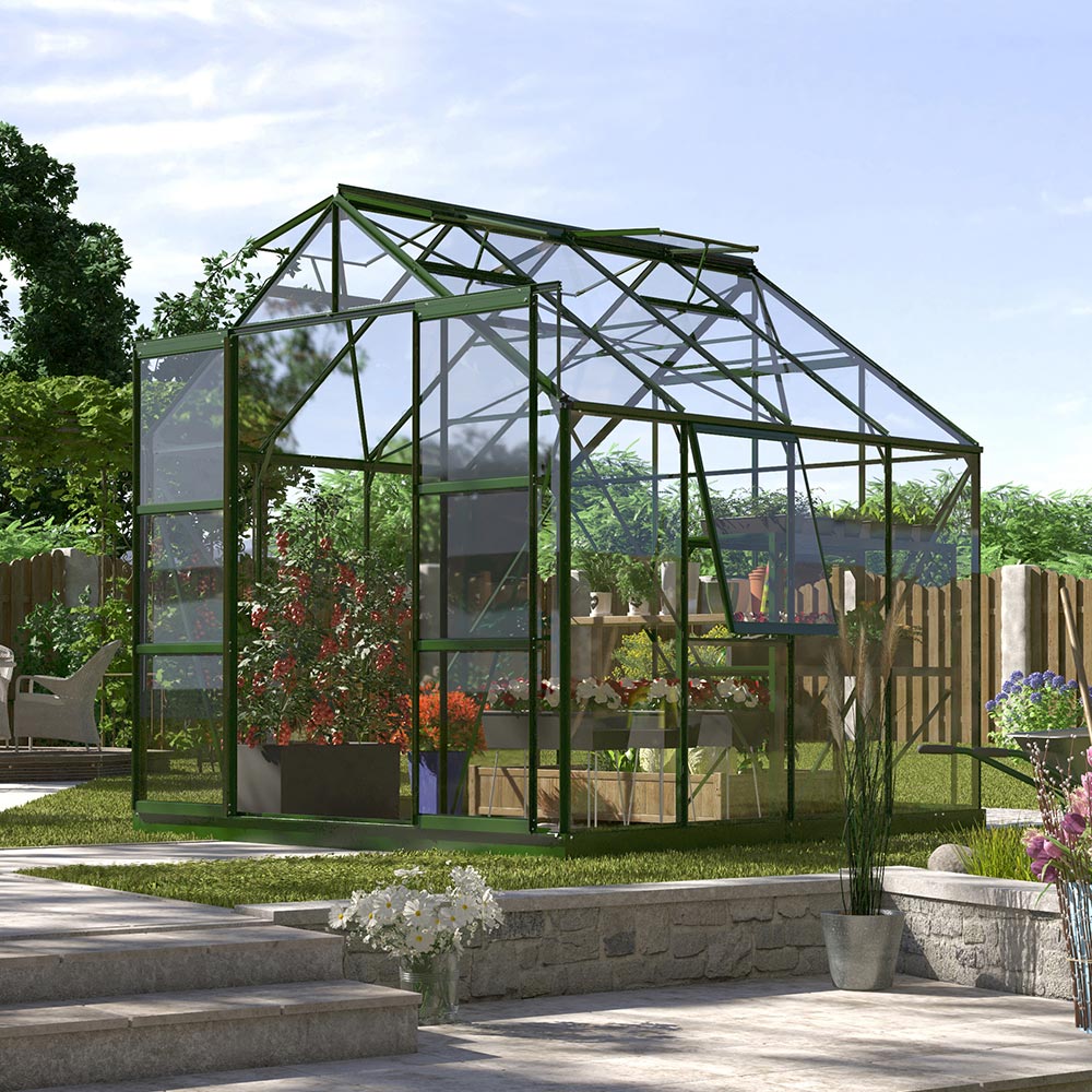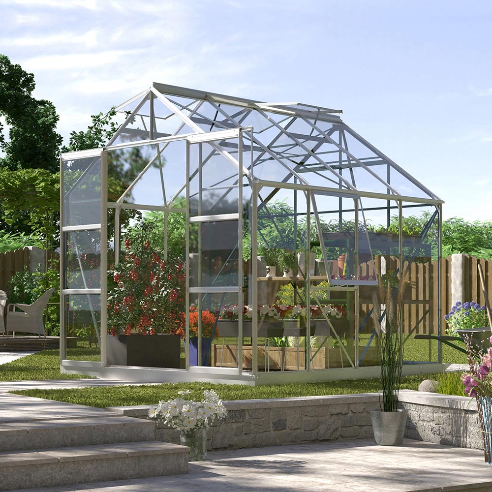 Aluminiumskonstruktionen er robust og vedligeholdelsesvenlig. Drivhuset giver mulighed for valg af ruder: fuldt sikkerhedsglas eller kanalplader (4mm eller 6mm) efter eget valg. Til ventilation er der to tagvinduer og ét sidevindue, og den dobbelte skydedør gør ind- og udgang nem. Tagrender er integreret for effektiv afledning af nedbør