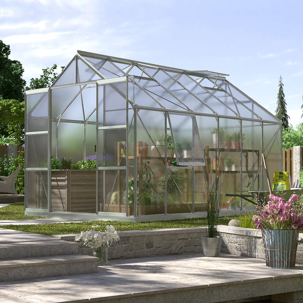 Aluminiumkonstruktionen er omhyggeligt opbygget til langvarig brug. Du kan vælge mellem følgende glastyper: fuldt 3 mm sikkerhedsglas, fuldt 4 mm kanalplade eller fuldt 6 mm kanalplade. Panelerne fastgøres med klemfjedre, hvor hvert glas- eller pladepanel klemmes sikkert mod rammen. De dobbelte skydedøre er udstyret med lås for sikker aflåsning. Ventilationen varetages af fire tagvinduer og et sidevindue, som tilsammen sikrer et godt kontrollerbart klima i drivhuset.