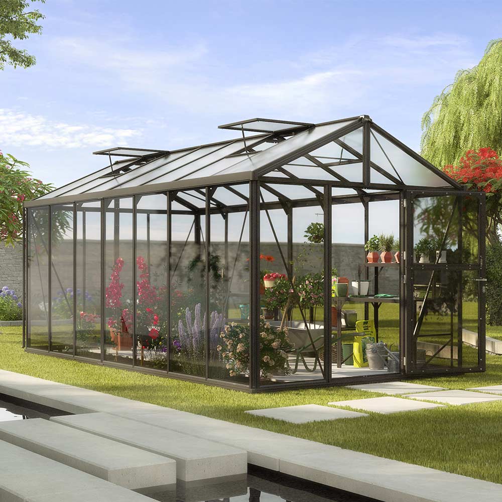 Zeus 13800 er det ideelle valg for gartneren, der vil investere i et rummeligt, luksuriøst drivhus med imponerende plads og førsteklasses finish. Med 13,8 m² gulvareal og en kipshøjde på 2,50 m kan du uden besvær stå oprejst og arbejde i en behagelig arbejdshøjde. Den stalddør, hvor over- og underdør kan åbnes uafhængigt af hinanden, giver raffinerede ventilationsmuligheder uden at du behøver at åbne døren helt. Takket være denne kombination af rummelig størrelse, smart ventilation og stilfuld udførelse er Zeus 13800 et ægte blikfang i haven.