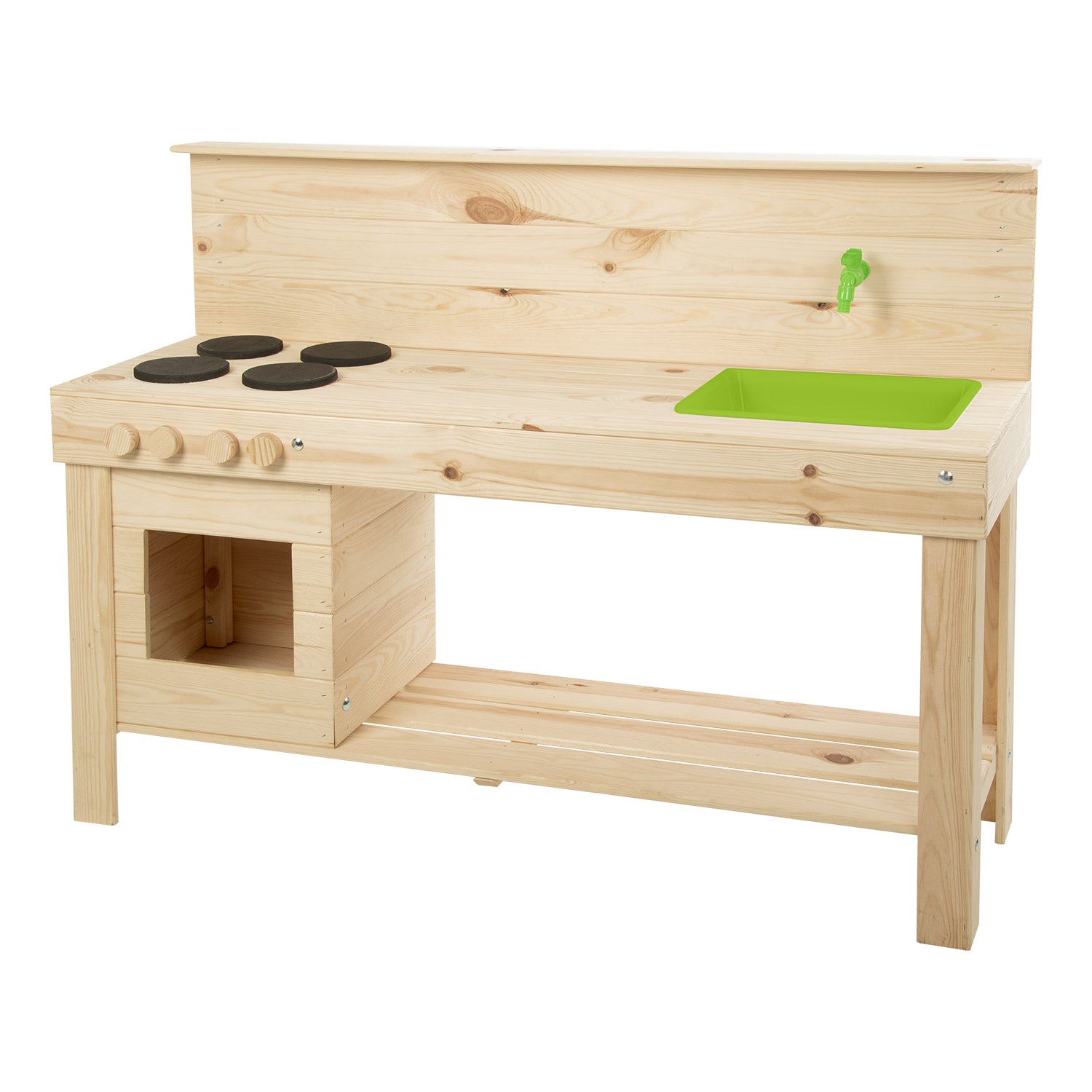Modderkøkken L er robust, fremstillet af holdbart FSC-certificeret fyrretræ, og har en ekstra lang arbejdsflade, perfekt til små kokke og haveentusiaster, der gerne leger sammen. Med en praktisk plastbalje og en hane, der kan tilsluttes en haveslange, får børn den fulde legeoplevelse med vand og mudder. Ideel til have, terrasse eller legeområde!
