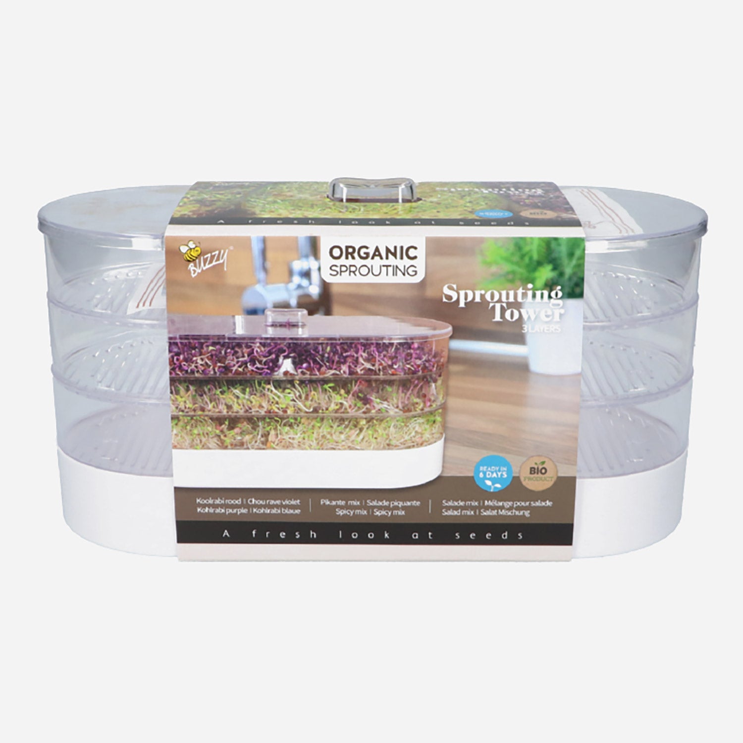 Buzzy Økologisk Spiring Tårn 3‑3-lags er et stabelbart spiretårn til at dyrke flere forskellige spirer derhjemme samtidig. Tårnet har tre lag med lufthuller og en base med vandopsamling, fremstillet af lysgennemtrængelig materiale.