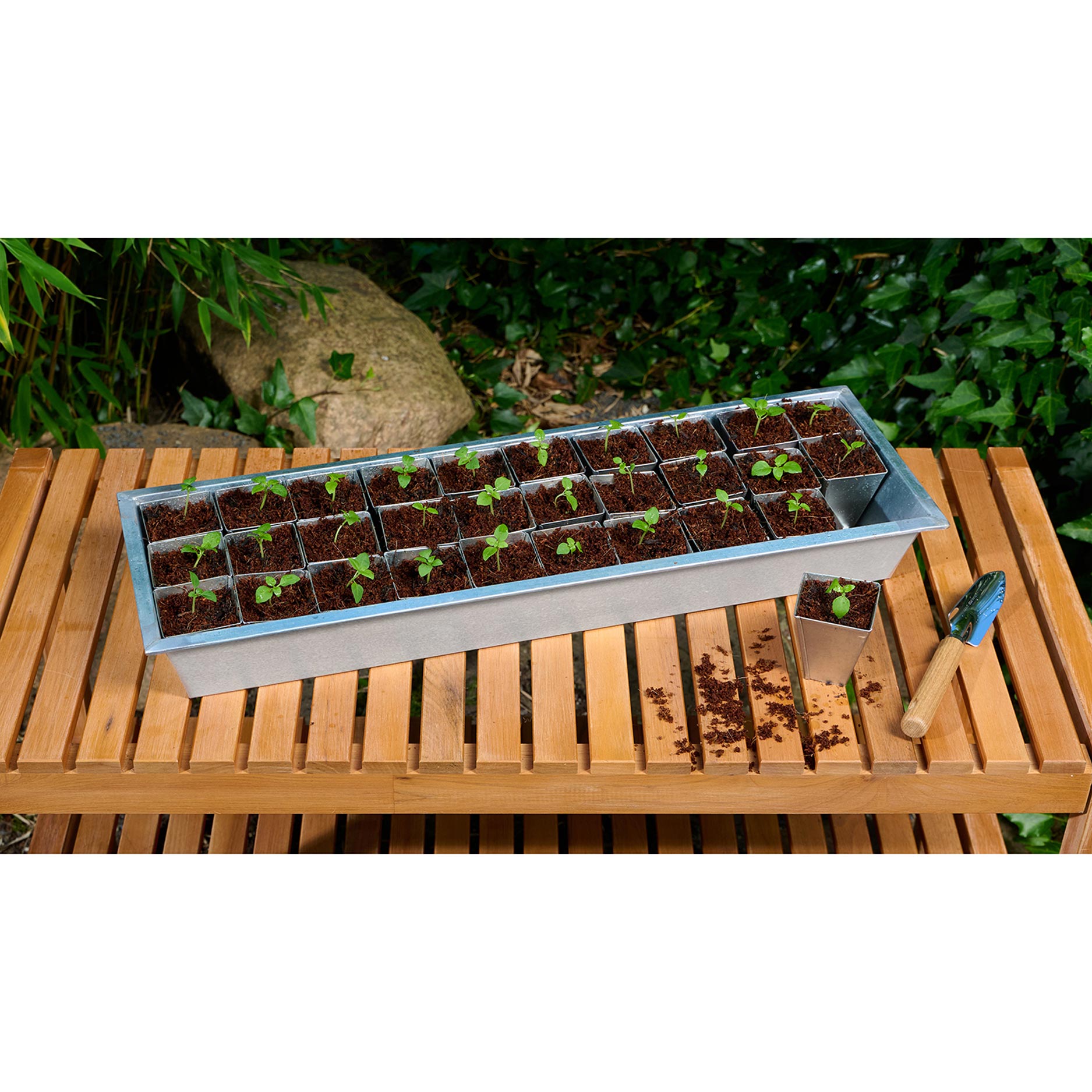 Såbakken i metal med potter, blank, er et sæt med en underbakke i blank farve og 30 farvede potter. Det er en solid, rustbestandig såbakke med tredive små metalpotter, ideel til at forspire frø af grøntsager, krydderurter eller blomster. Potterne er genanvendelige og holdbare.