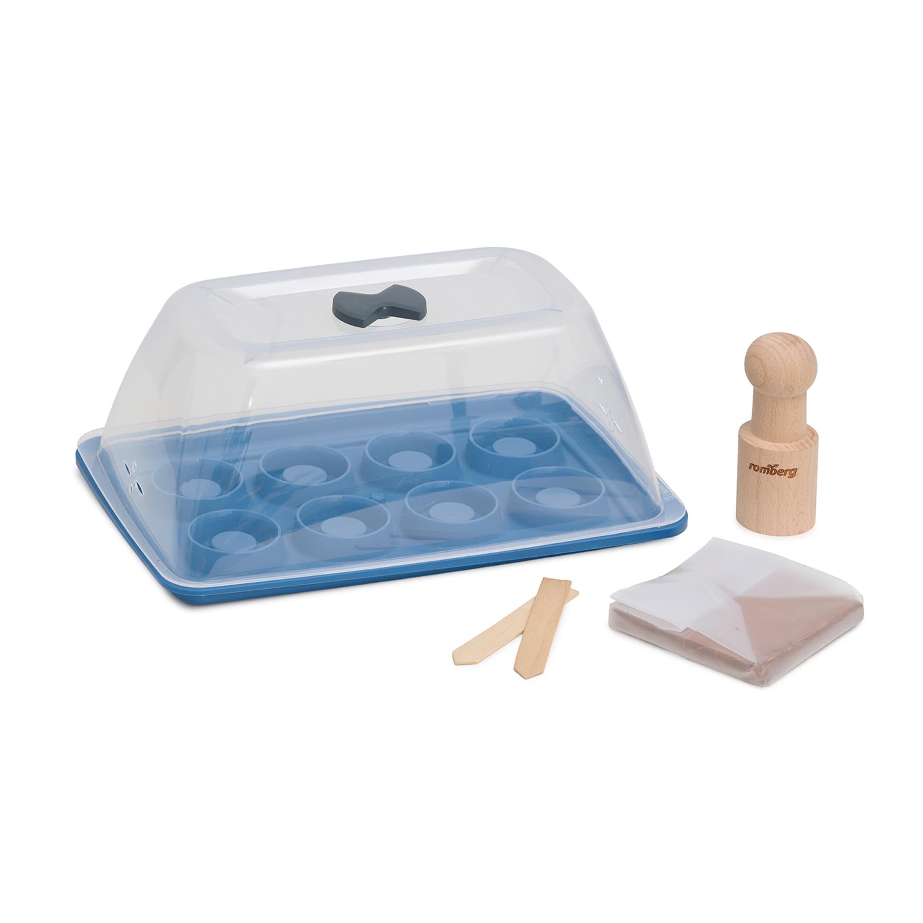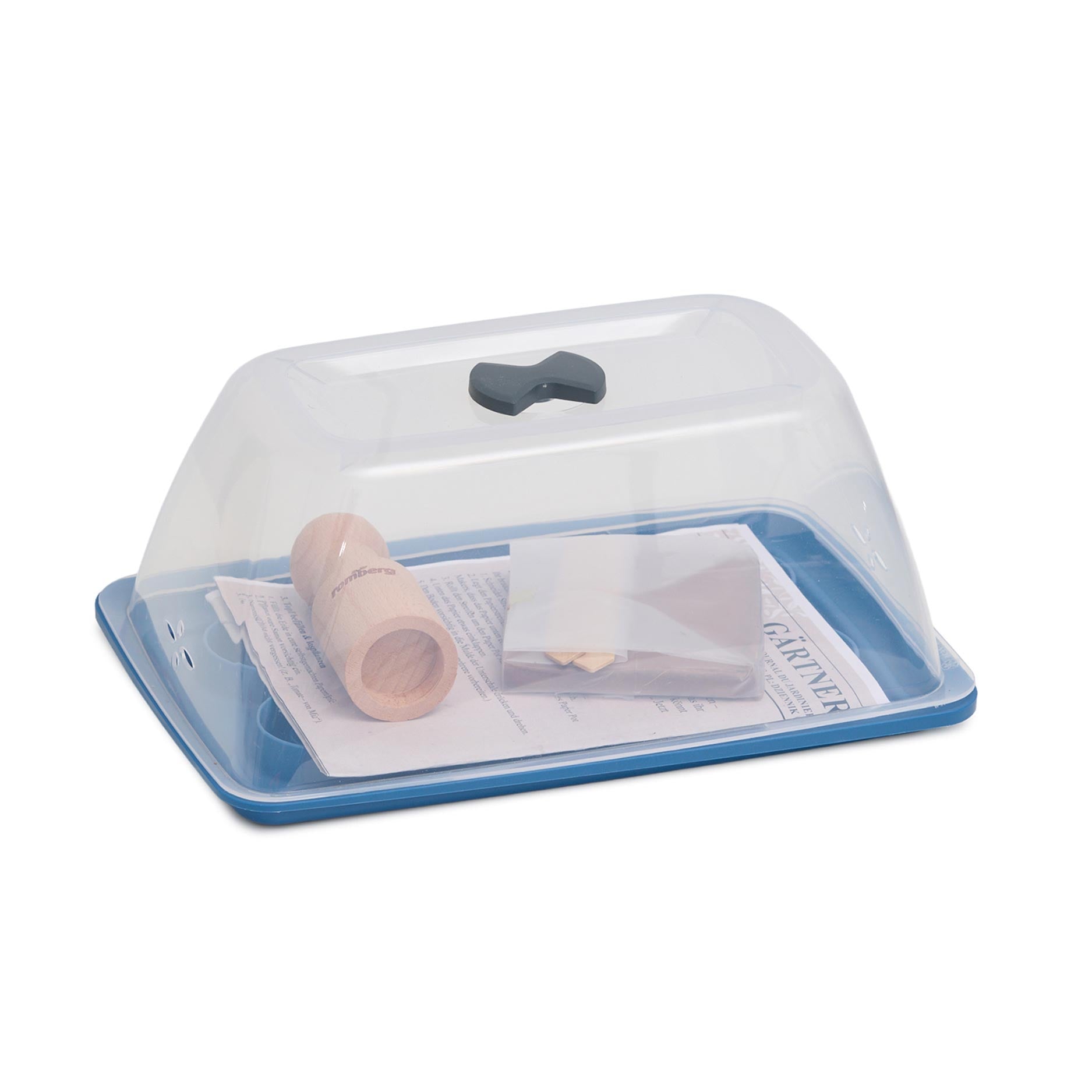 Starters Kweekset er et komplet dyrkningssæt til alle, der nemt selv vil så og forspire planter. Sættet består af en robust bakke, et transparent låg med regulerbar ventilation, en papirpresse i træ til at lave potter af avispapir samt tørvefri kokos-pottemuld. Designet er beregnet til brug indendørs, i vindueskarmen eller på altanen. Det indeholder alt, hvad du skal bruge for at komme i gang med at så med det samme.