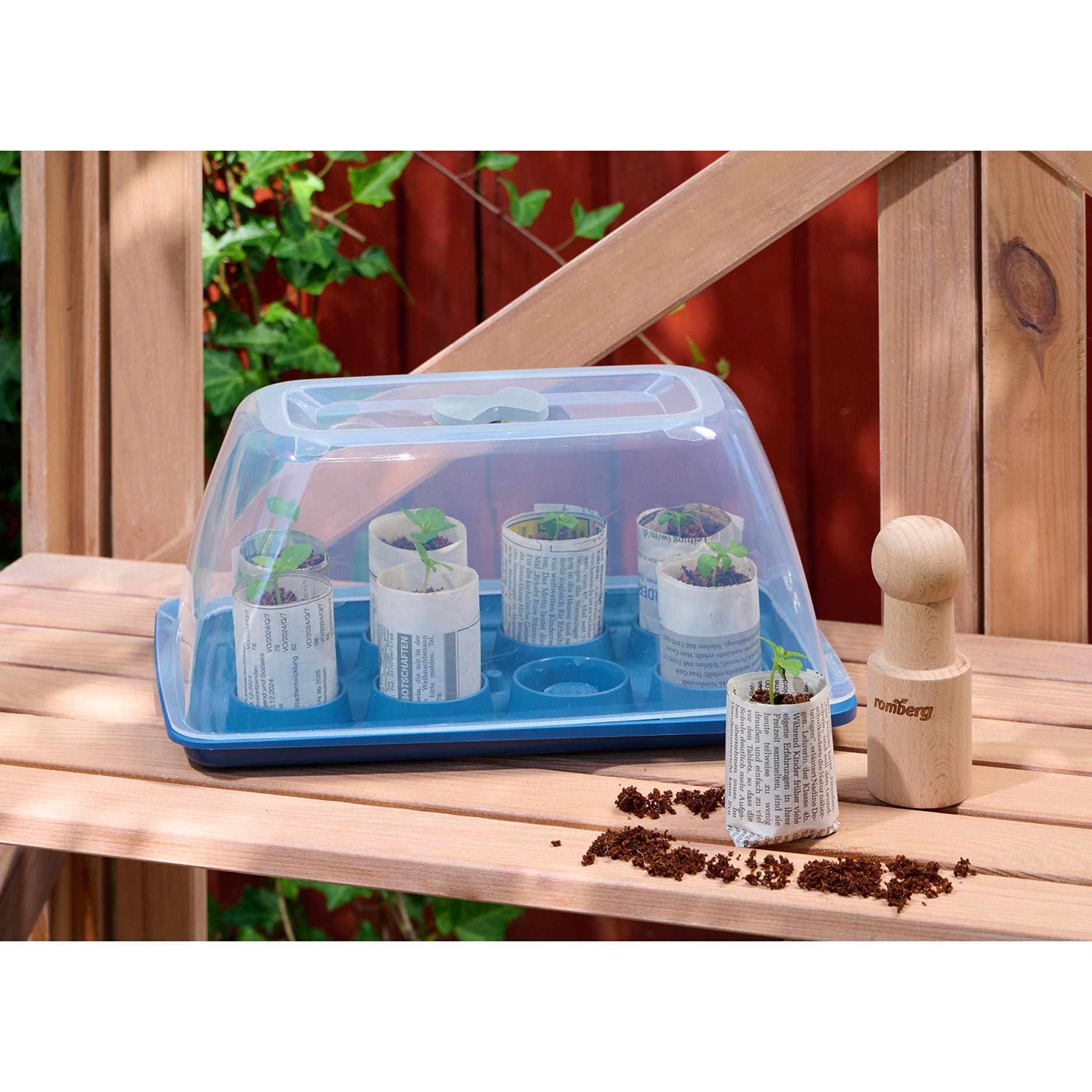 Brugen er enkel: Med træpressen former du først små potter af gammelt avispapir. Derefter lader du kokosjorden svulme op med vand, fylder potterne og sår dine foretrukne grøntsags-, krydderurte- eller blomsterfrø. Potterne placerer du i bakken og lukker med det transparente låg, som skaber et varmt og fugtigt mikroklima, hvor frø spirer hurtigt. Regelmæssig udluftning og at holde det let fugtigt er nok til, at de unge planter vokser sig stærke.