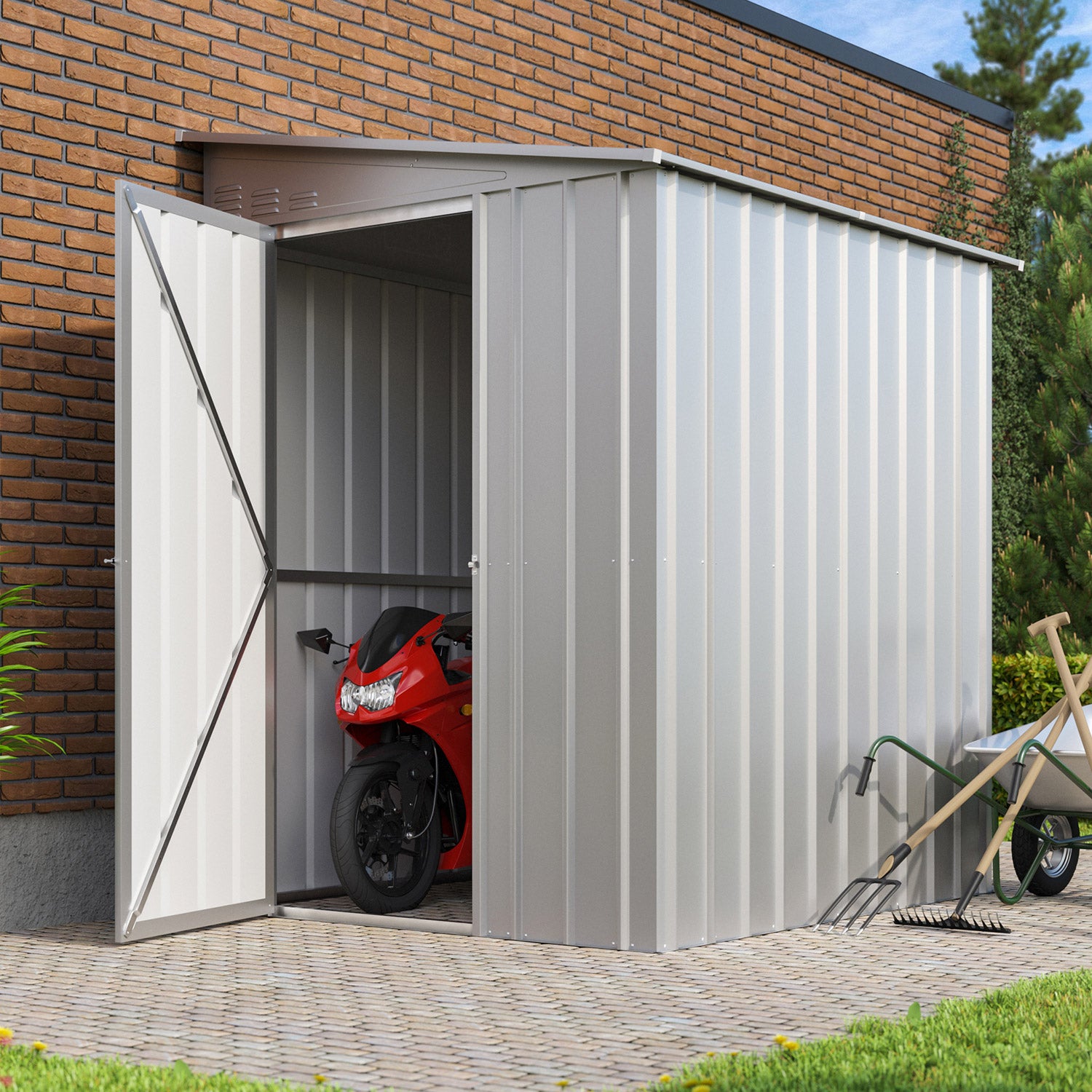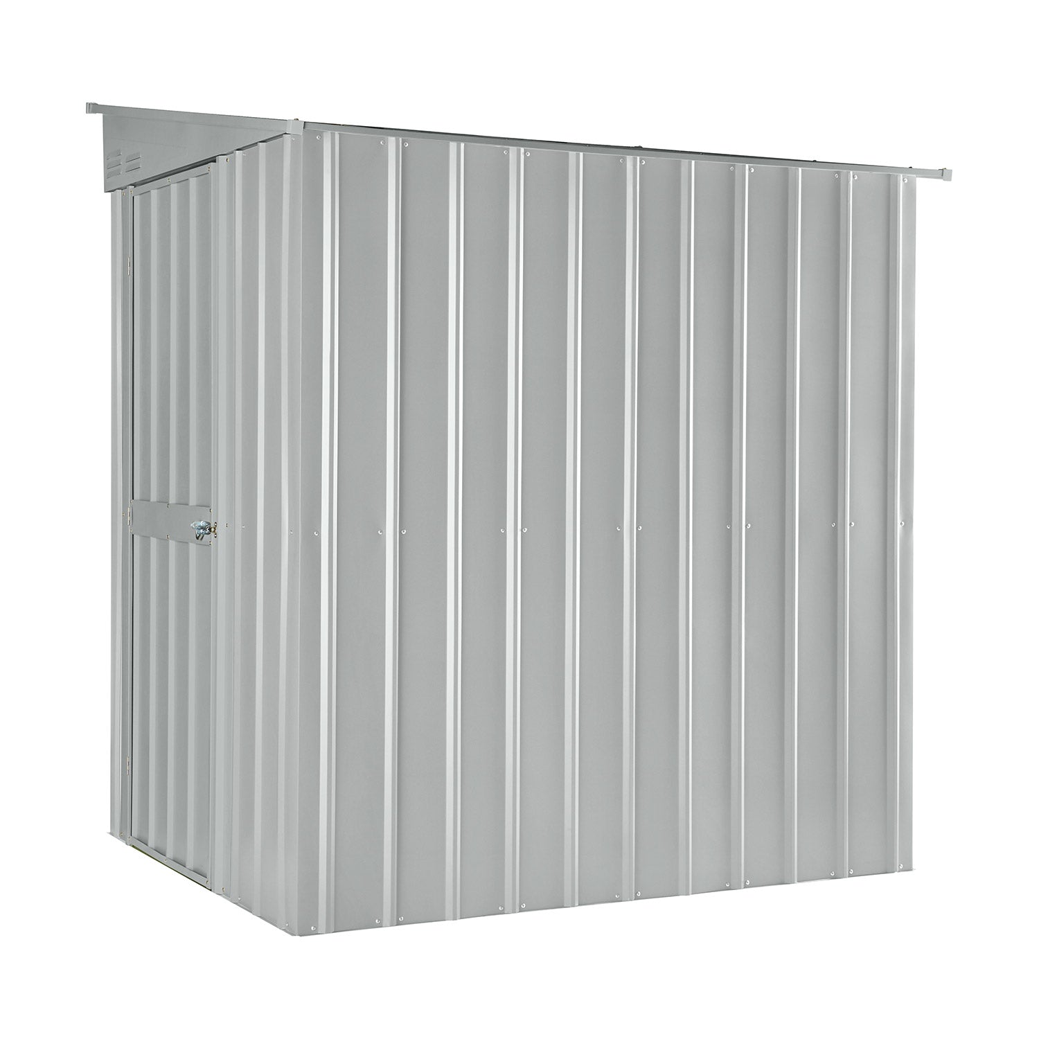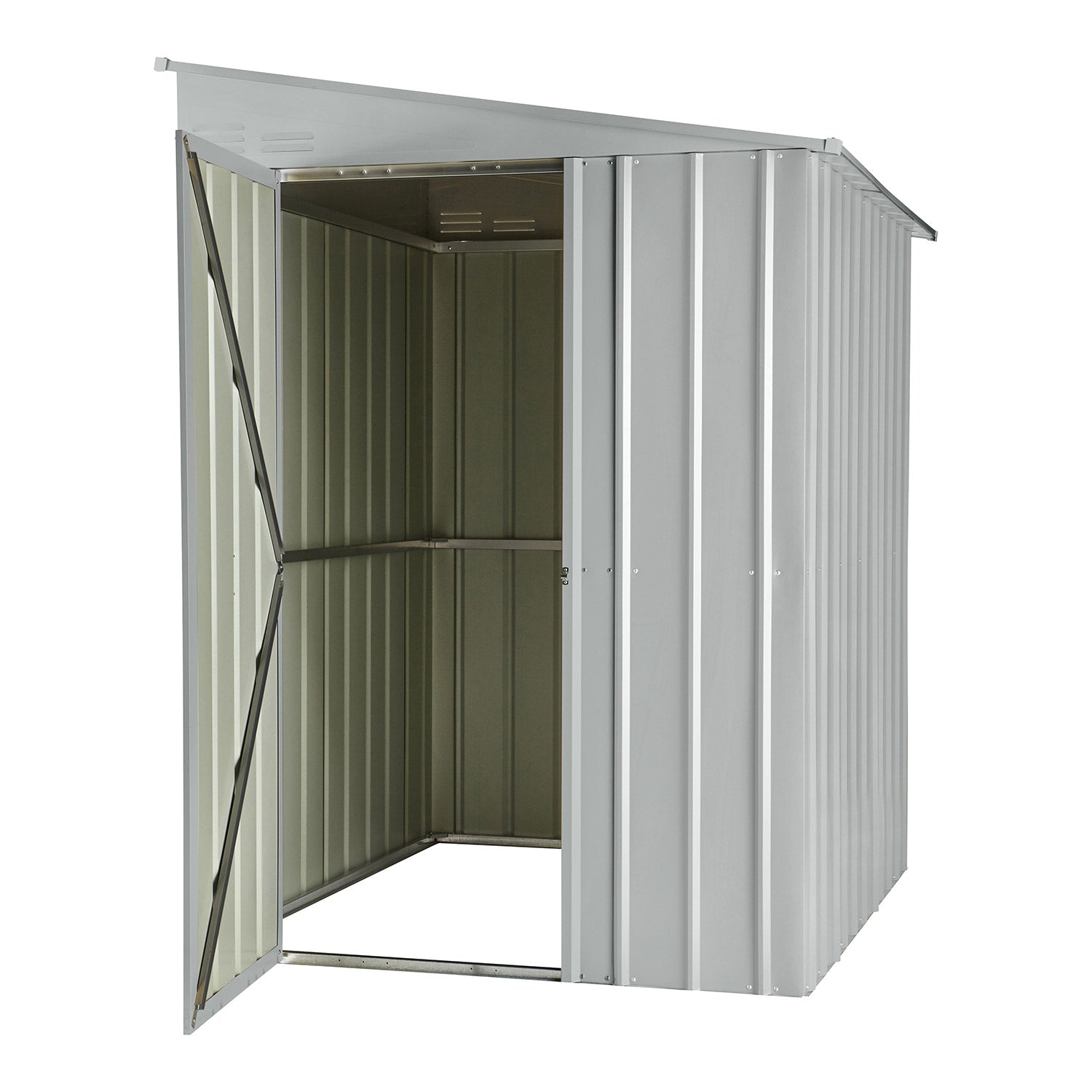 De Lean-To 56 er et unikt skur med et moderne udtryk. Dette skur er perfekt til placering i længderetningen op ad en lang mur. Med et areal på 2,46m2 kan du nemt få plads til cykler, reolskabe og arbejdsbænke. Dette rummelige metalskur fås i 3 farver. Alle udvendige dele er emaljerede og termisk galvaniserede. Ikke alene giver denne behandling en fremragende beskyttelse mod elementerne, den er også meget ridse- og stødresistent. Lean-to har en enkel, udadgående dør på 67cm i bredden, som kan monteres i for- eller bagsiden.