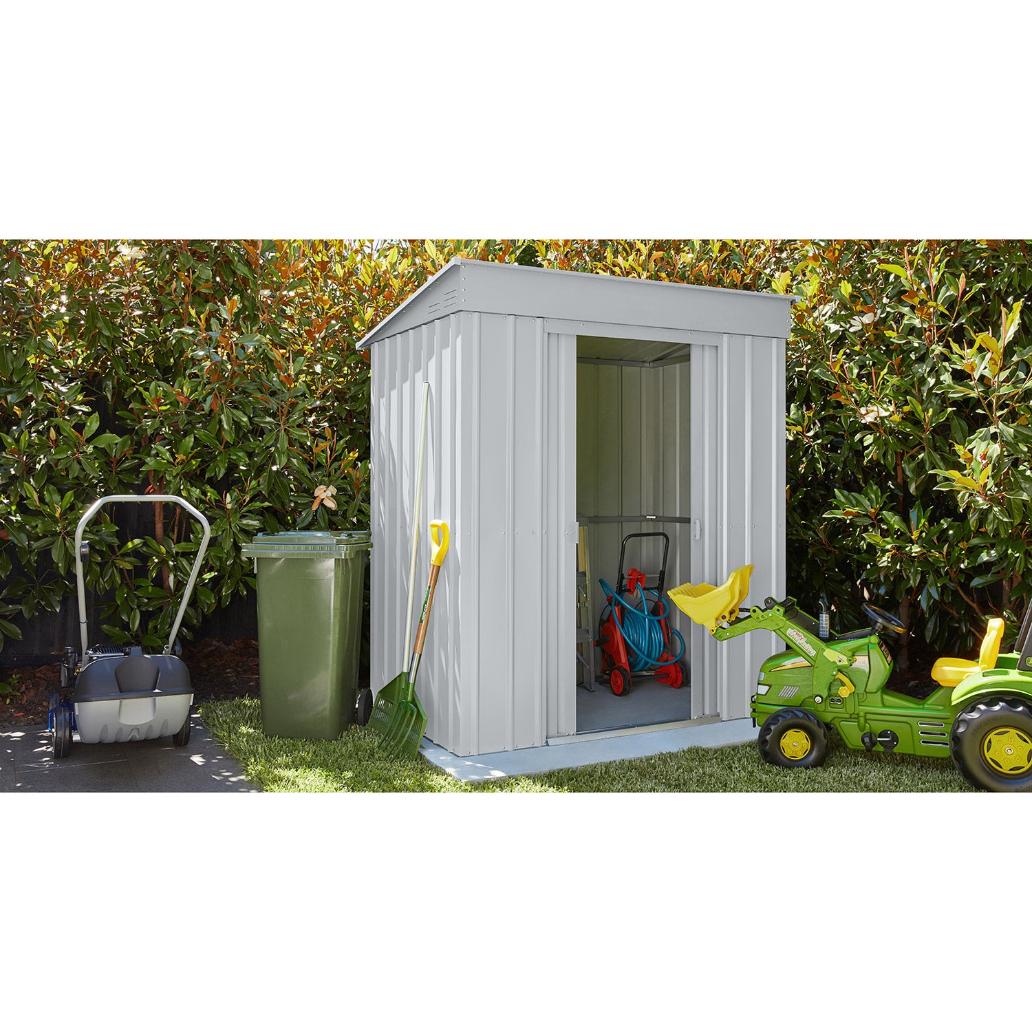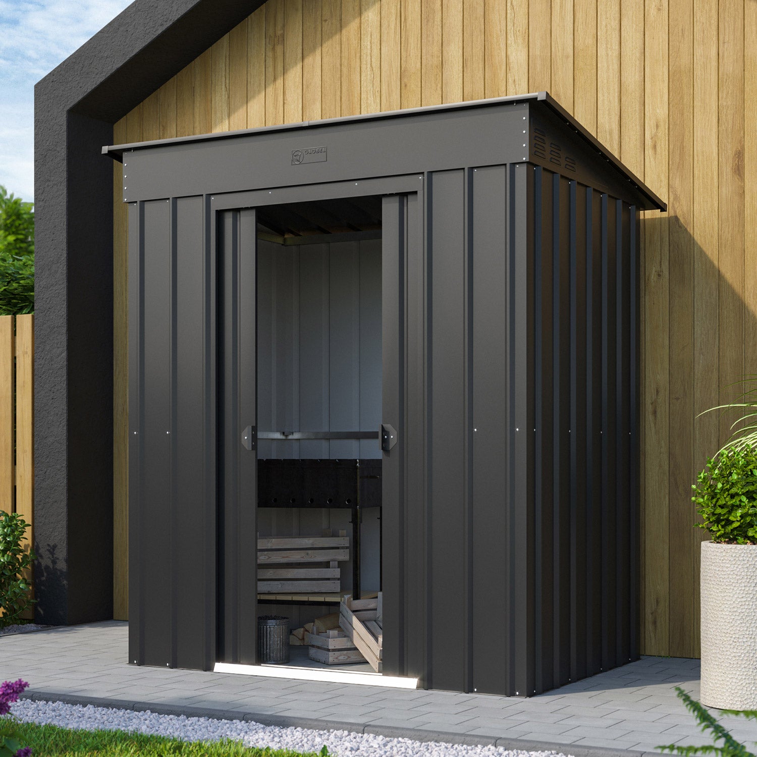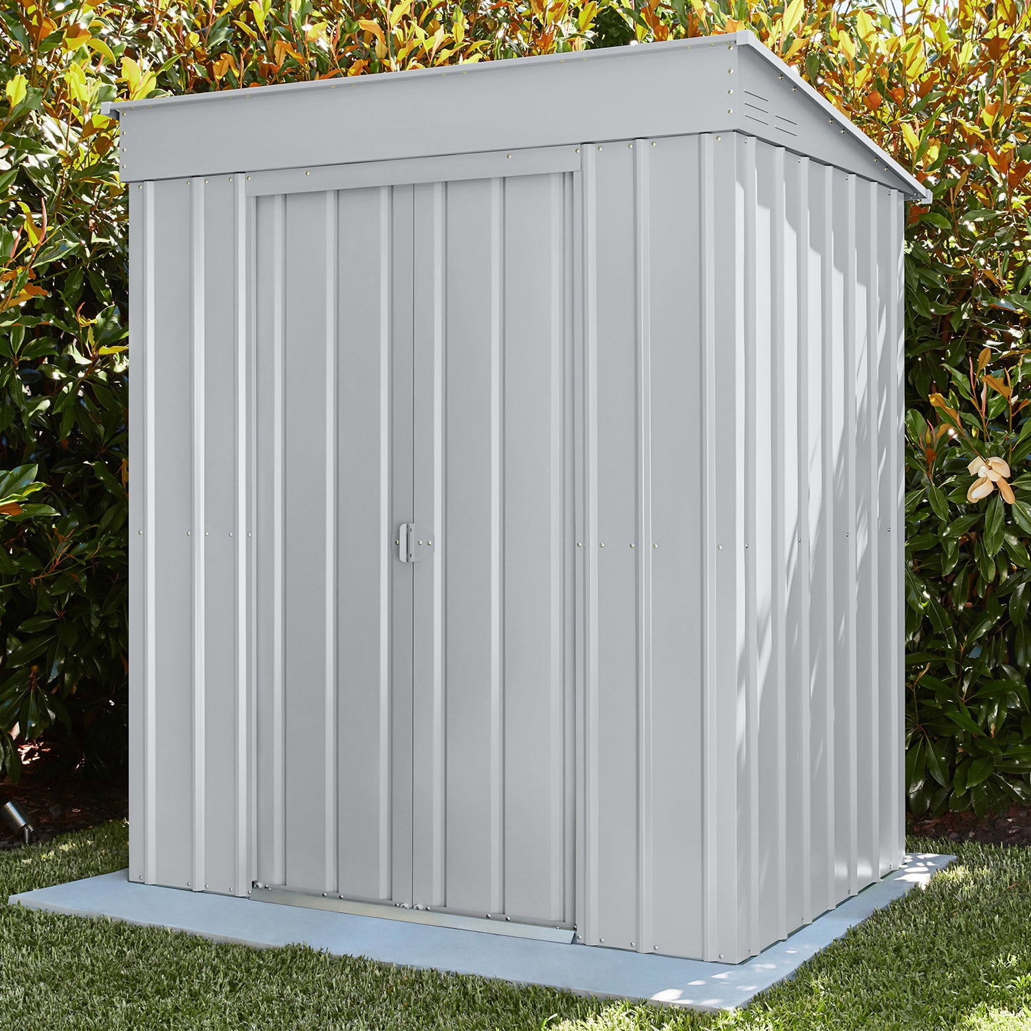 De Skillion 64 er et kompakt skur med et moderne udtryk. Dette skur er perfekt til placering, i bredden, op ad en lang mur. Med et areal på 1,93m² kan du nemt få plads til en cykel, reolhylder eller en arbejdsbænk. Dette flotte metalskur fås i 2 farver. Alle udvendige dele er emaljerede og termisk galvaniserede. Denne behandling giver ikke kun fremragende beskyttelse mod vejrpåvirkninger, den er også meget ridse- og slagfast. Skillion har en dobbeltskyde dør med en samlet bredde på 64cm. Og vil du hellere opbevare noget udendørs? Med udvidelsesmodulet kan du montere et ekstra tag på Skillion-skuret, så du kan skabe en pæn overdækning.