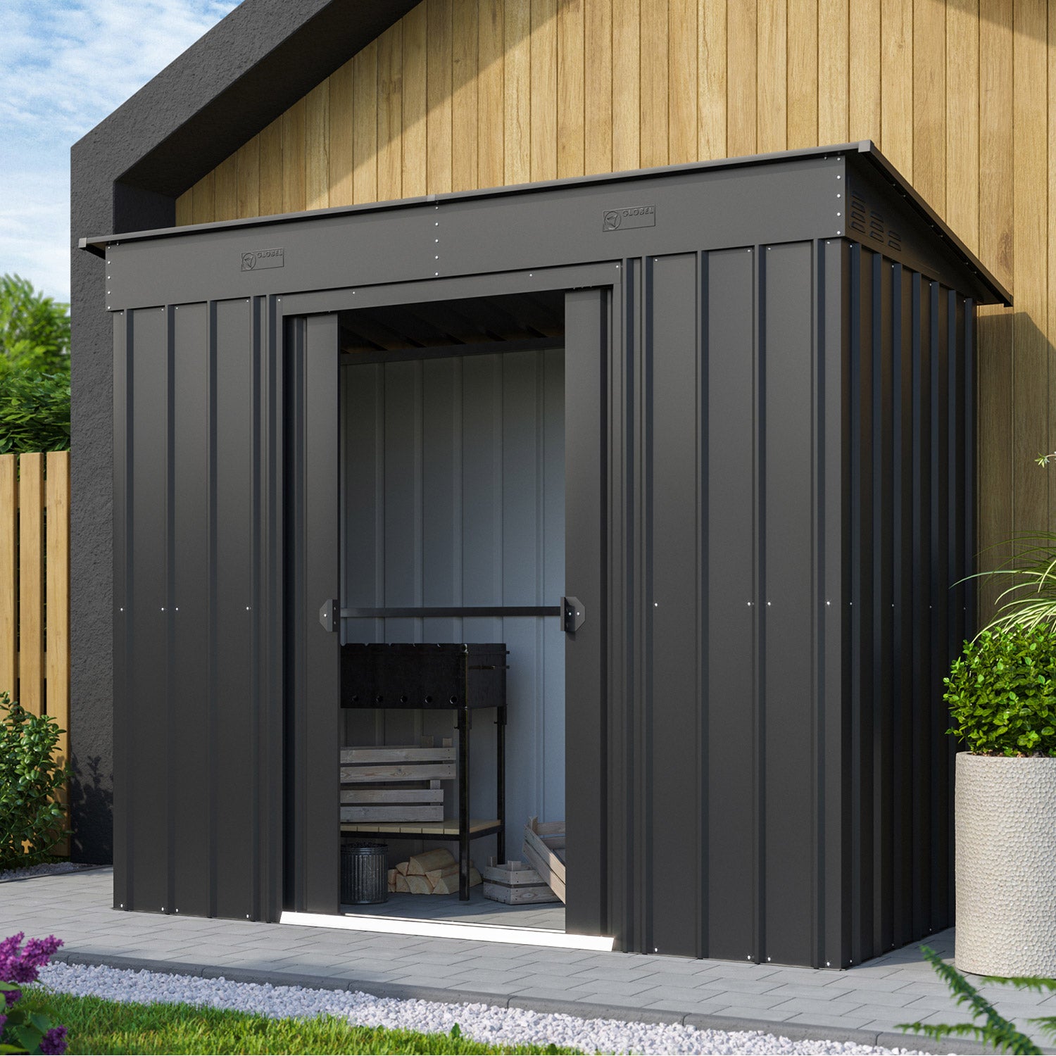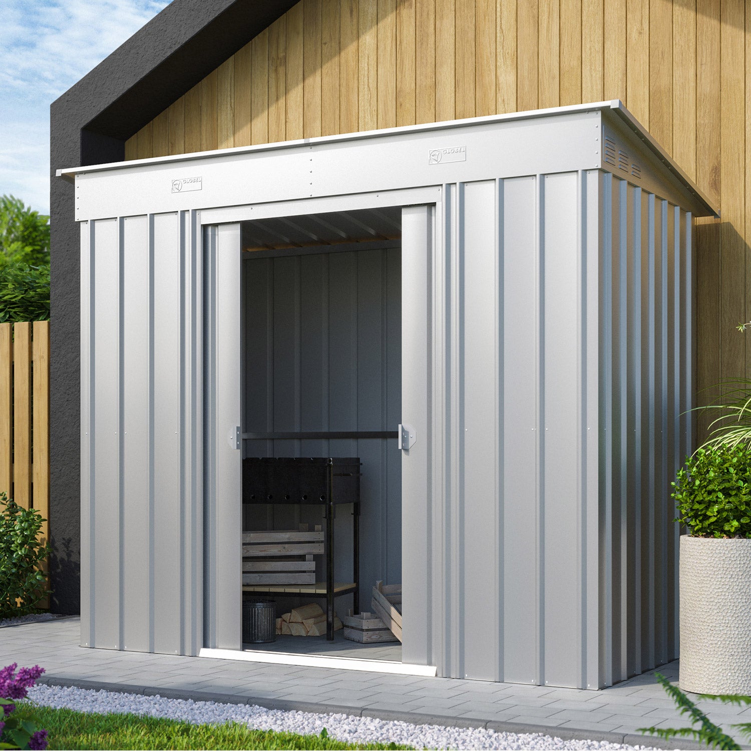 De Skillion 84 er en kompakt skur med et moderne udtryk. Dette skur er perfekt til placering, i bredden, op ad en lang mur. Med et areal på 2,64m² er der fint plads til en cykel, reolhylder eller en arbejdsbænk. Dette flotte metalskur fås i 2 farver. Alle udvendige dele er emaljerede og termisk galvaniserede. Ikke alene giver denne behandling en fremragende beskyttelse mod elementerne, den er også meget ridse- og slagfast. Skillion har en dobbeltskydedør med en samlet bredde på 105cm. Og vil du hellere opbevare noget udenfor? Med udvidelsesmodulet kan du montere et ekstra tag på Skillion-skuret, så du kan skabe en fin overdækning.