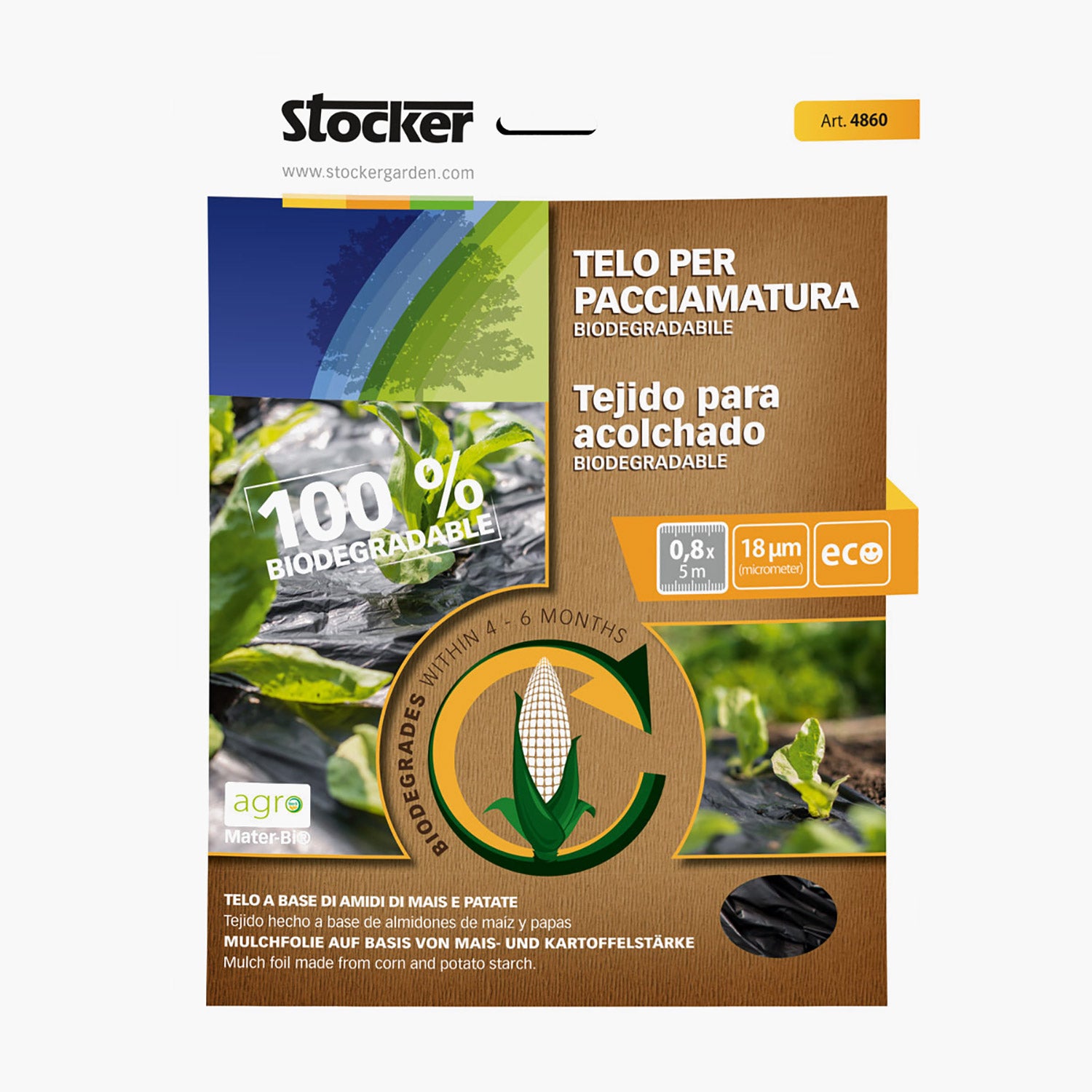 Det, der gør denne mulchfolie ekstra særlig, er, at den er fuldt biologisk nedbrydelig. Den er fremstillet af naturlige materialer som majs- og kartoffelstivelse og nedbrydes af sig selv 100 % i jorden efter 6 måneder (processen starter fra 3 måneder). Folien efterlader ingen rester, giver ikke jordforurening og er ikke toksisk.
