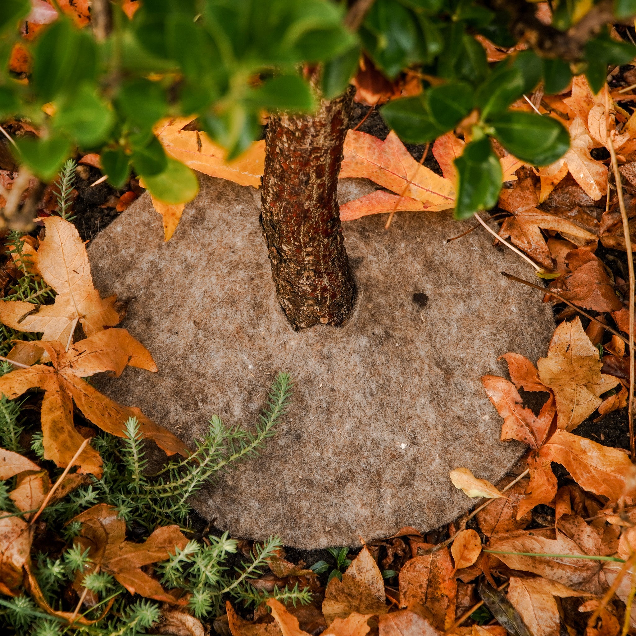 Mulchringen er nem at bruge: Læg den direkte på jorden rundt om træets stamme, så åbningen i midten ligger pænt omkring stammen. Den solide, fiberrige struktur bliver liggende godt på plads uden ekstra fastgørelse, også i regn eller blæst. Ulden lader vand og luft passere, samtidig med at den holder jorden nedenunder fugtig og varm – perfekt til unge eller sårbare nyplantninger.