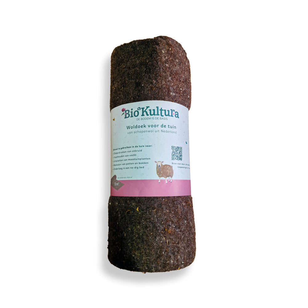 Uld-mulchdugen fra Bio Kultura er et naturligt nedbrydeligt dækmateriale, fremstillet af 100% fåreuld. Dugen er udviklet specifikt til at hæmme ukrudtsvækst, holde på fugten i jorden og regulere temperaturen omkring planterne. Den egner sig til brug i køkkenhaver, bede, plantefelter og træskiver.