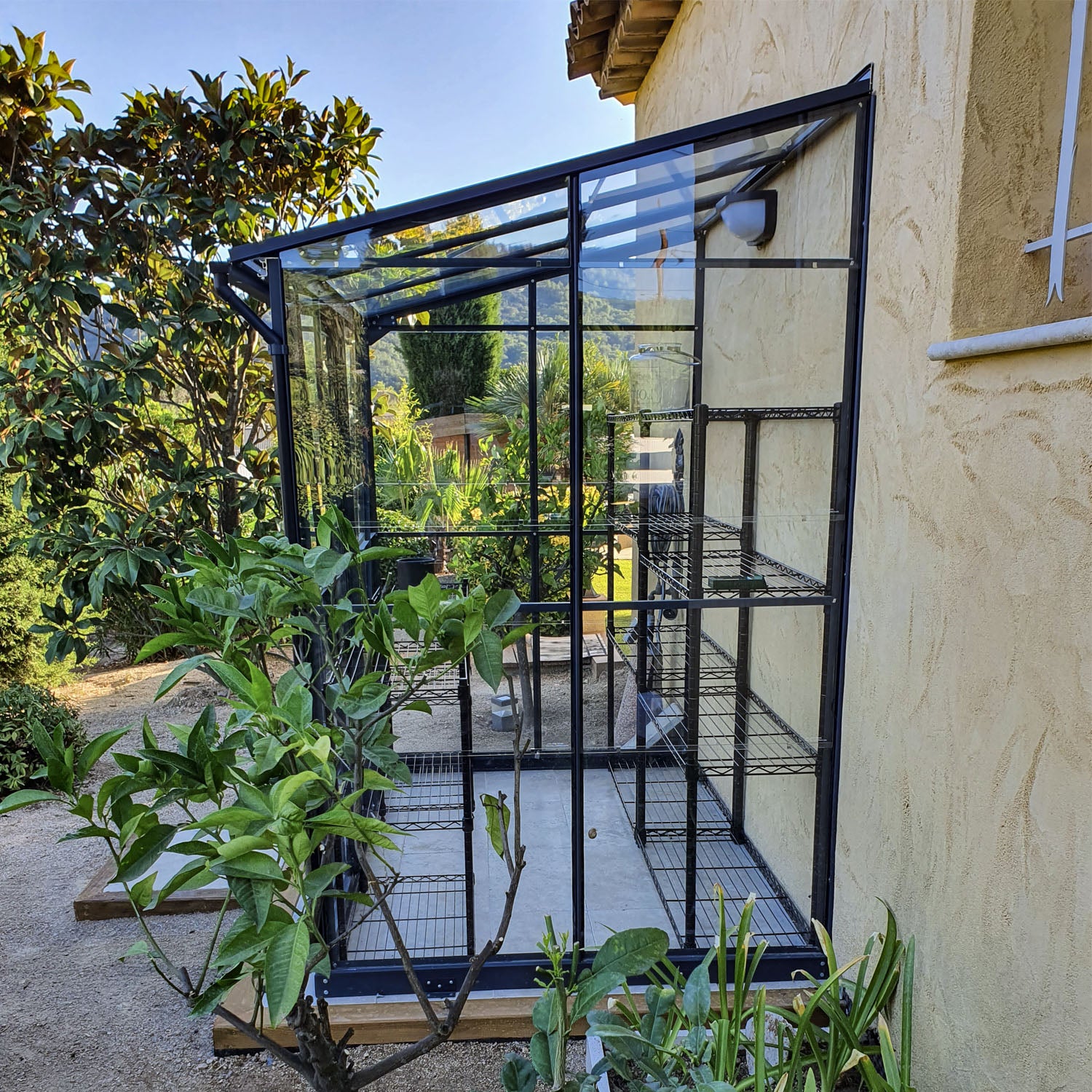 Drivhuset er fremstillet af robuste aluminiumsprofiler og sikkerhedsglas, med skydedør og tagvindue til naturlig ventilation. Fundamentrammen og afledning af regnvand fuldender sættet. Et tilgængeligt og holdbart drivhus, der kan følge med Deres have i mange år.