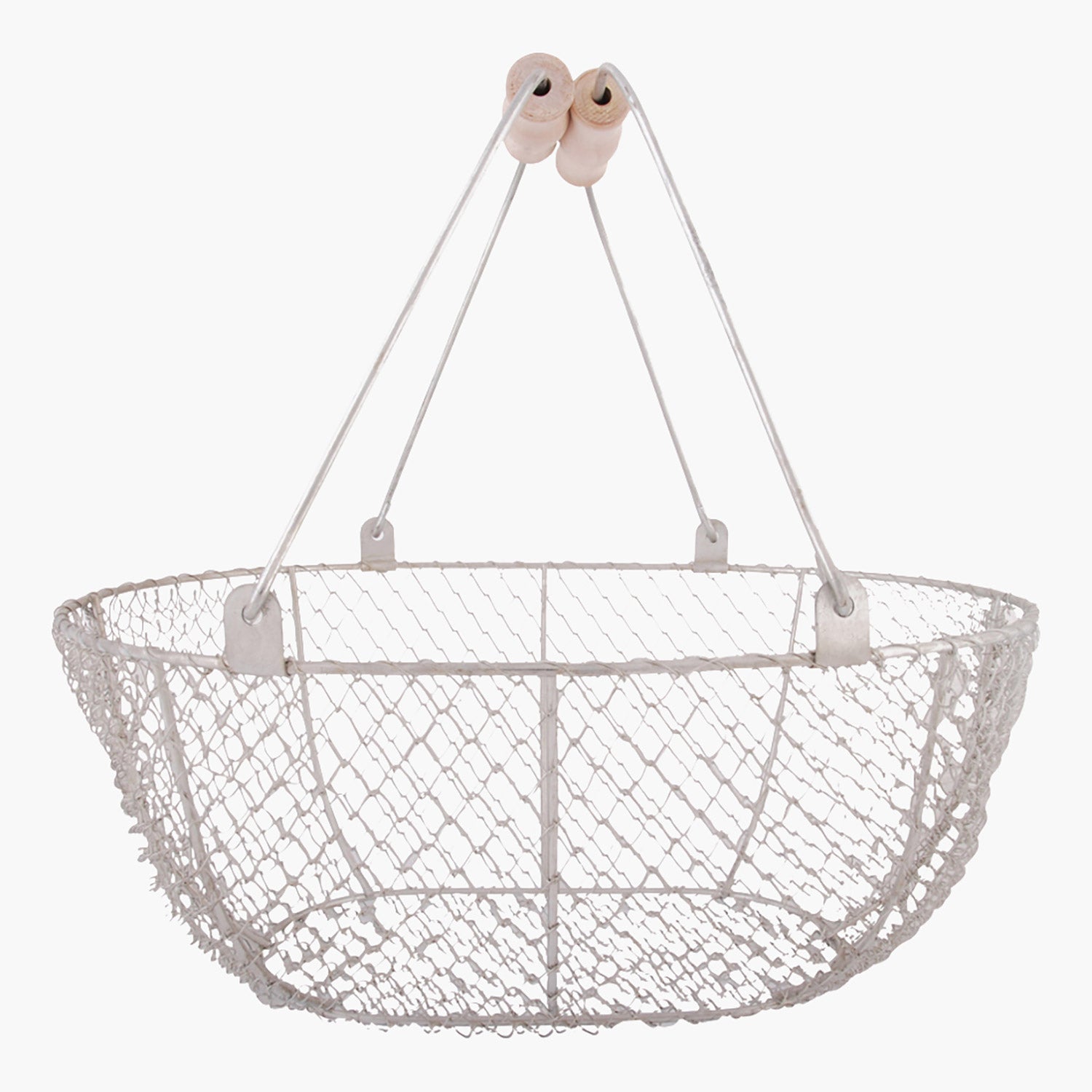 Flot høstkurv i galvaniseret metaltråd med træhåndtag. I modsætning til De Wiltfangs hårde metalkurve giver denne metaltråd en smule efter.