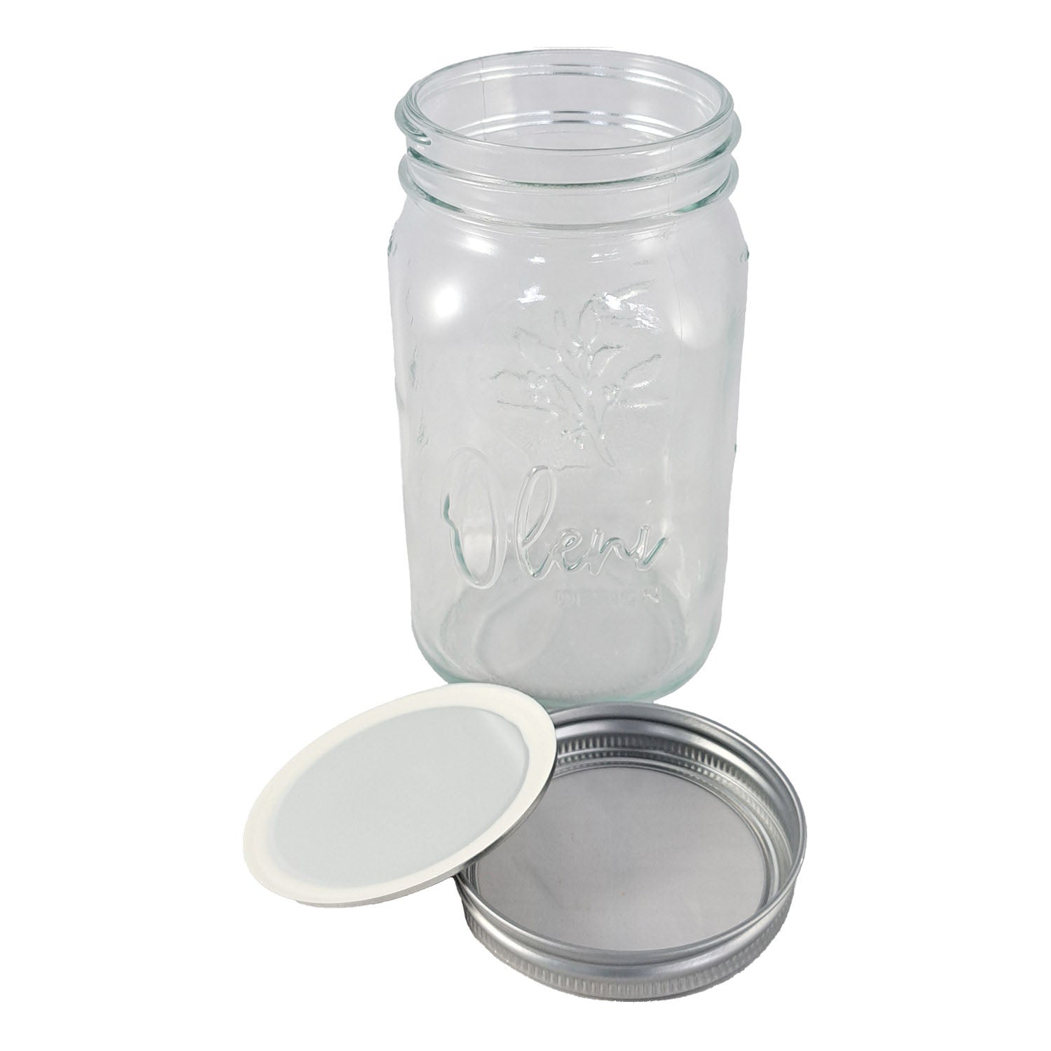 Wide: 17 x 10,2 cm (1000ml), Hals ø 8,6cm med 2-delt låg - Materiale: Glas - det medfølgende låg lukker glasset lufttæt