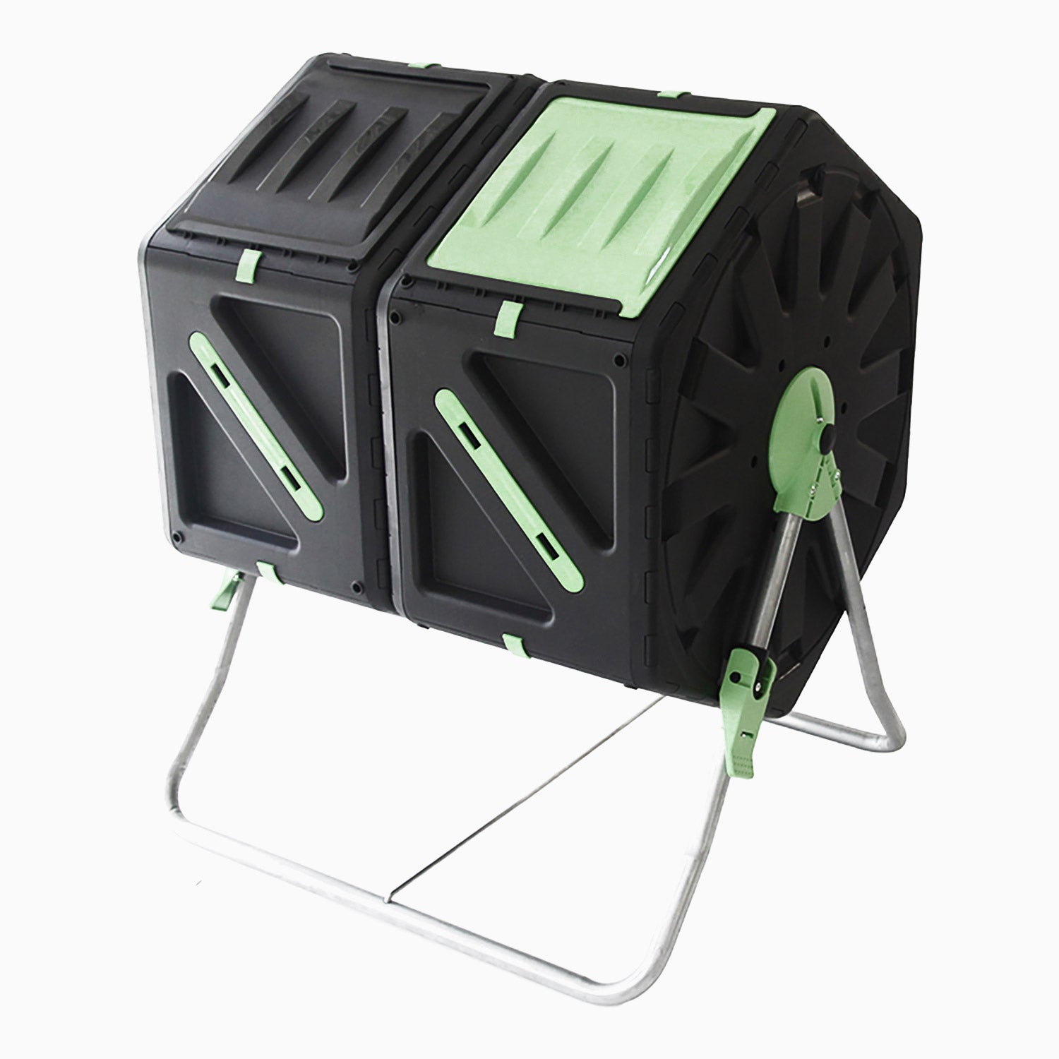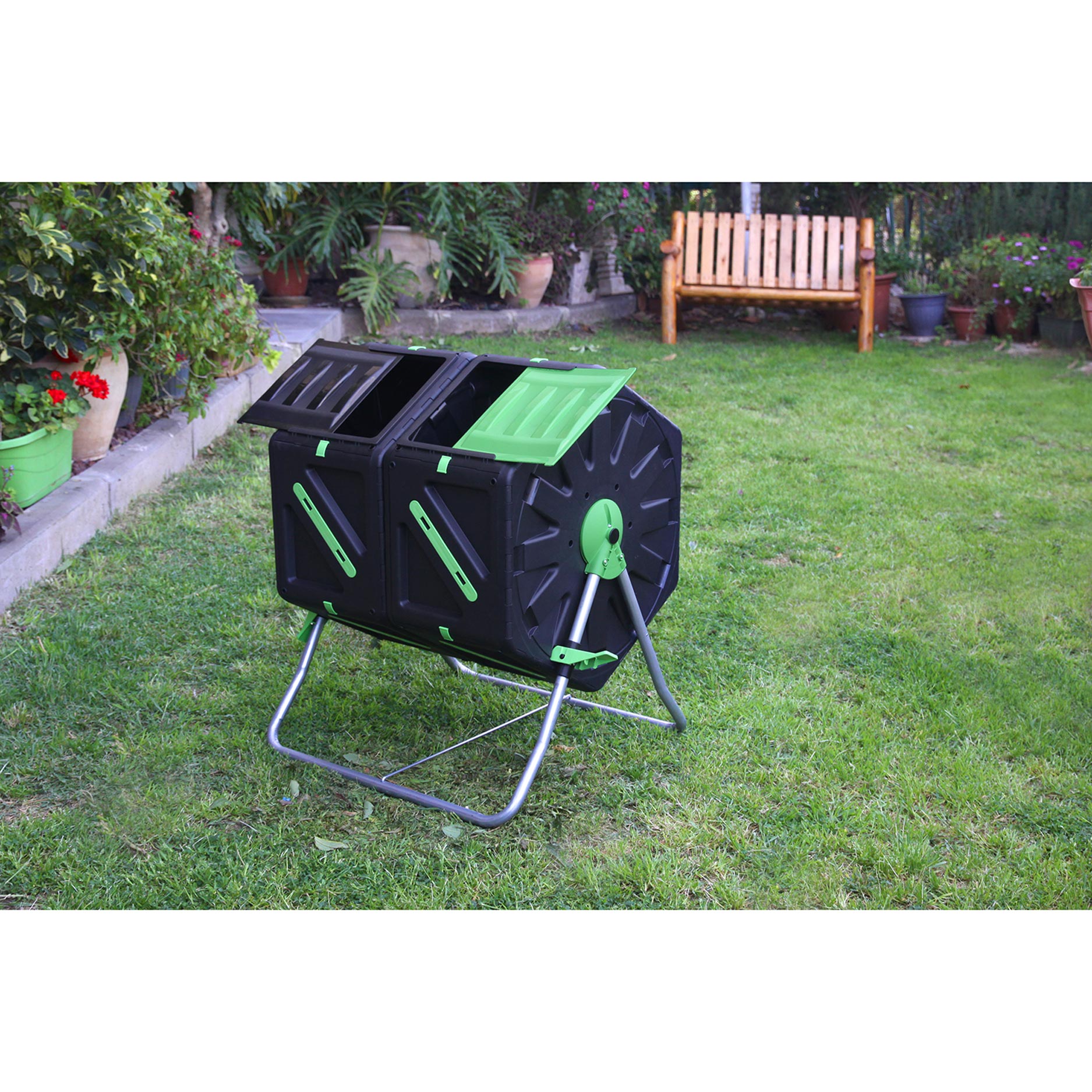 For at bruge kompostbeholderen fylder du den skiftevis med “brunt” materiale (såsom tørre blade, kviste, papir) og “grønt” materiale (såsom køkkenrester, græs, grøntsager) for at skabe en god balance. Luk låget, og drej tromlen regelmæssigt, så der tilføres ilt, og komposteringen fremskyndes. Efter ca. 6 til 8 uger kan du høste færdig kompost, afhængigt af forholdene (fugtighed, temperatur og det rette materialeforhold). Med denne model med 2 rum kan du fylde den ene side, mens den anden er i gang med at kompostere.
