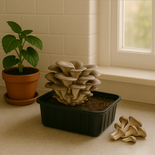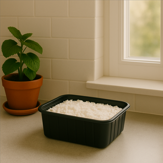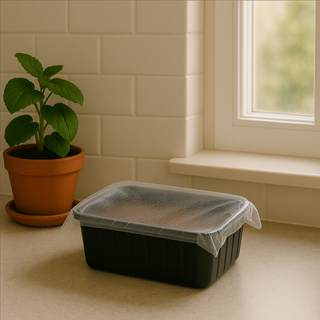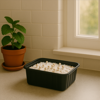 Åbn låget på dyrkningssættet. Fordel det medfølgende podningsmateriale (sporer eller mycelium) jævnt over vækstmediet, og dæk let til med den medfølgende folie eller et fugtigt stykke køkkenrulle.