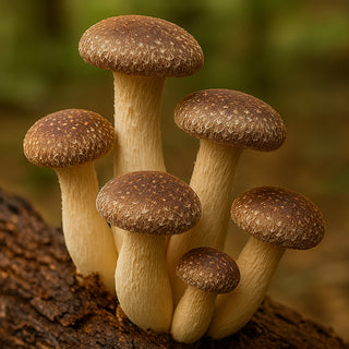 Shiitake har en unik, fyldig umami-smag og ser flot ud på en dyrkningsblok. Høsten kommer i “flushes”, hvilket betyder, at du kan høste flere gange fra ét dyrkningssæt.