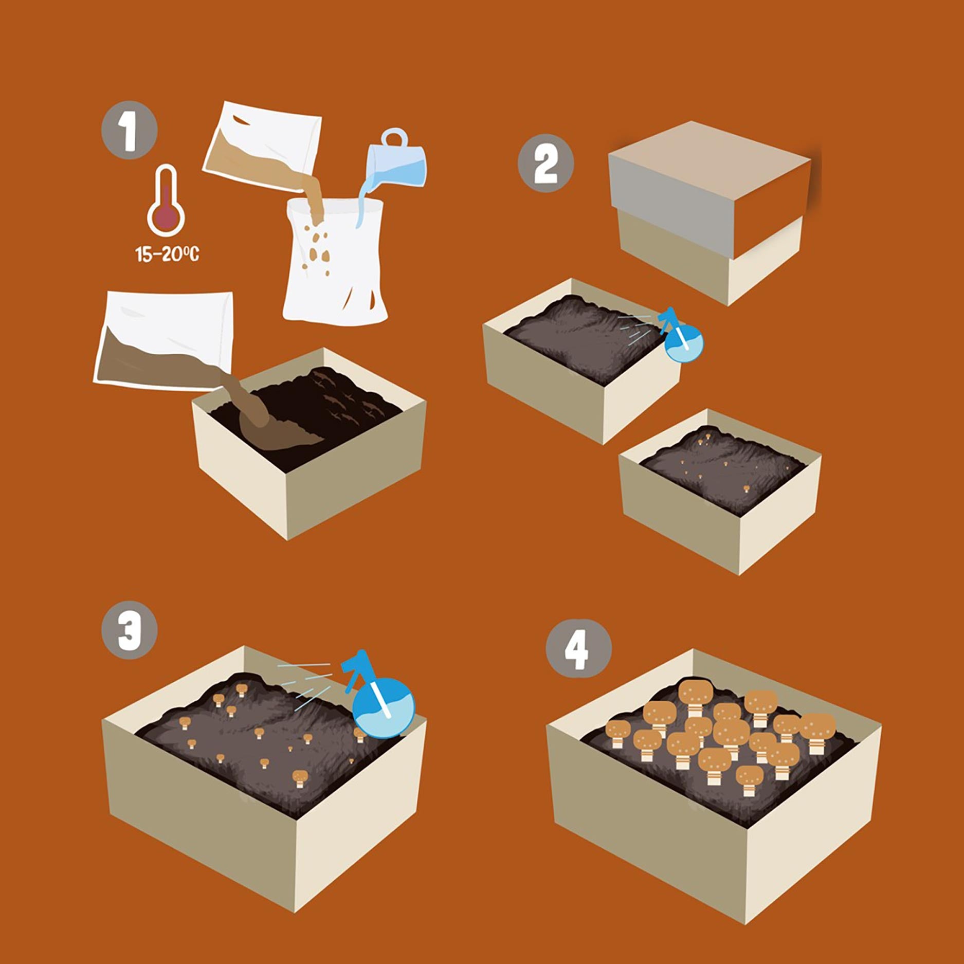 Dette dyrkningssæt gør det nemt og sjovt at dyrke kastanjechampignoner. Substratet er allerede fuldt podet med mycelium – du skal blot aktivere toplaget ved at gøre det let fugtigt og stille bakken et mørkt, køligt sted. Inden for få dage ser du de første knopper dukke op, og efter cirka to uger kan du høste dine første champignoner. Sættet giver ofte flere flushes, så du kan have glæde af din egen høst i længere tid.