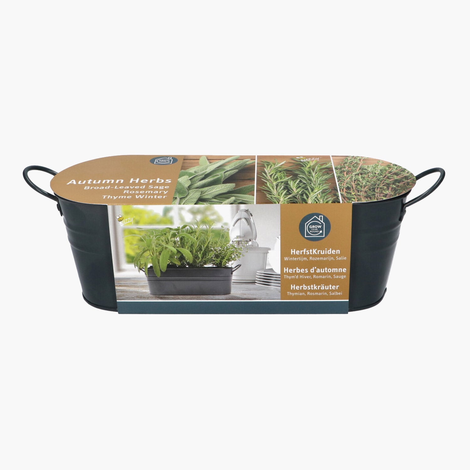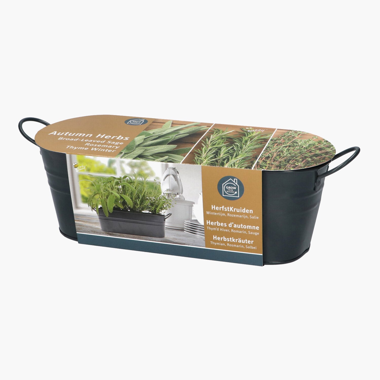Antracitfarvet balje Najaars Herfstkruiden, et komplet dyrkningssæt til alle, der elsker friske krydderurter. Denne balje indeholder alt, hvad De skal bruge for at komme i gang: jord og frø af salvie, rosmarin og timian. Disse skønne krydderurter er perfekte at dyrke i efteråret, så De kan nyde friskkrydrede retter hele sæsonen.