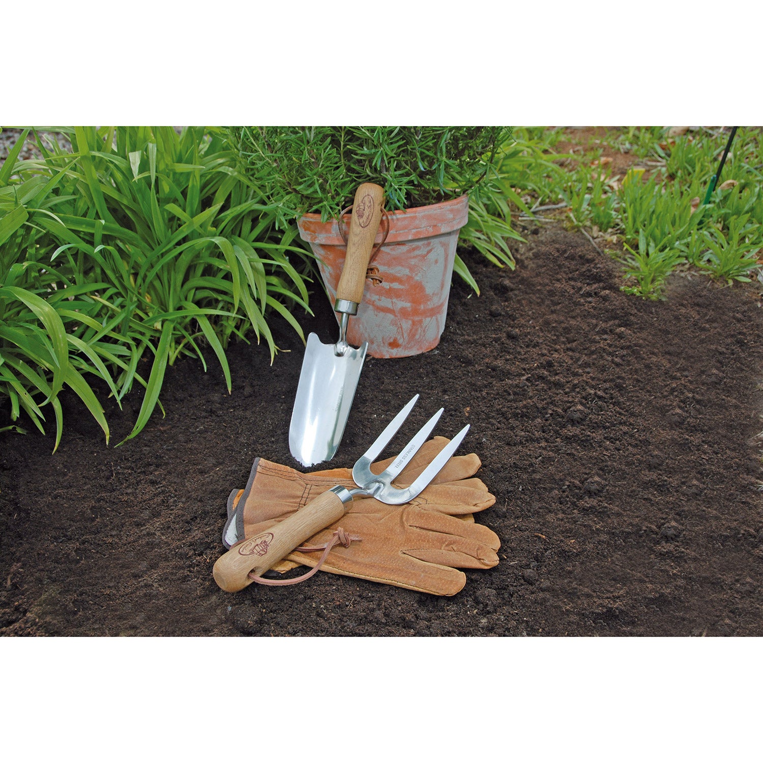 Traditionelt haveværktøjssæt til alle med grønne fingre. Det holdbare materialevalg sikrer, at sættet holder i lang tid. Dette havesæt er basis til det små arbejde i haven og i udendørs krukkebeplantning. Planteskovlen egner sig til mange formål i haven, såsom omplantning eller fjernelse af ukrudt. Håndkultivatoren er meget velegnet til at bryde jorden og løsne den. De robuste handsker i svinelæder med et autentisk udtryk beskytter hænderne mod snavs.