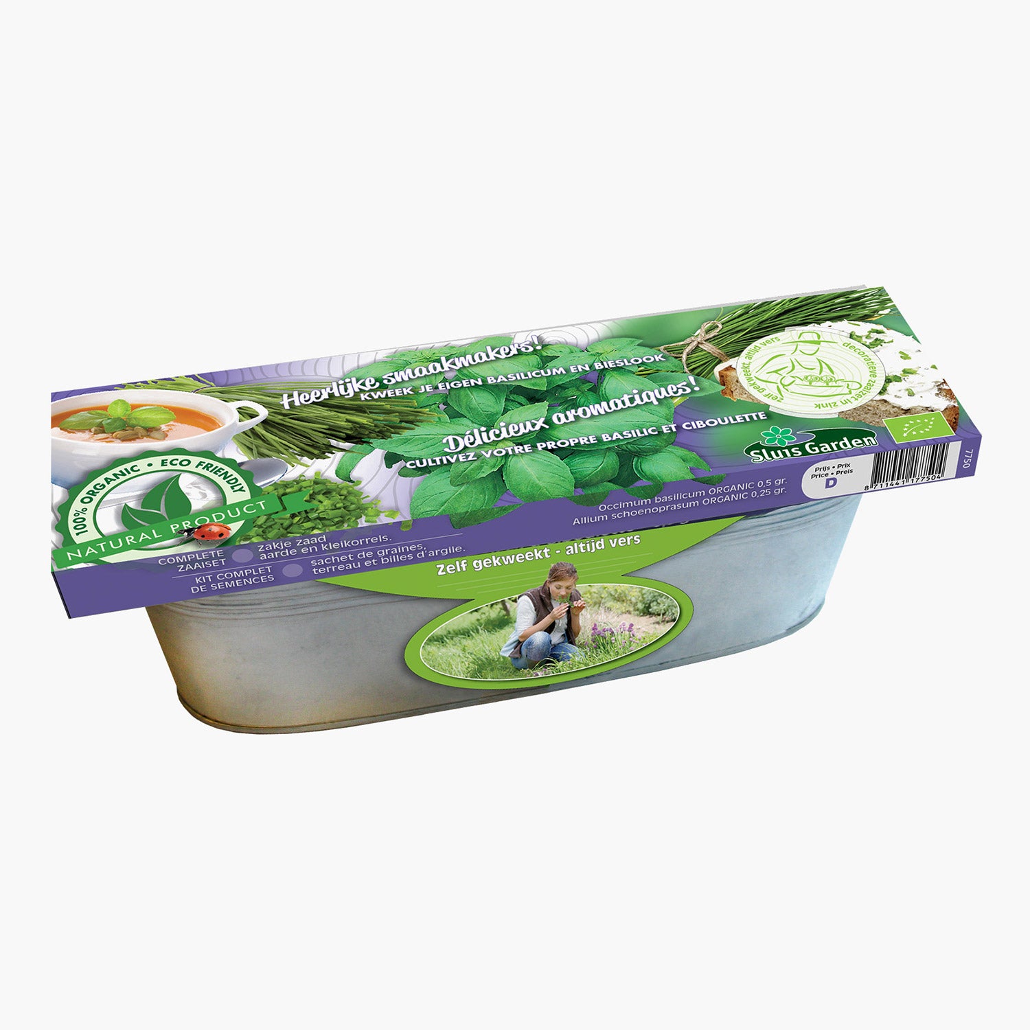 Den lille balje leveres med en pose pottemuld, inklusive hydrokugler for optimal dræning, samt en pose økologiske frø af basilikum og purløg.